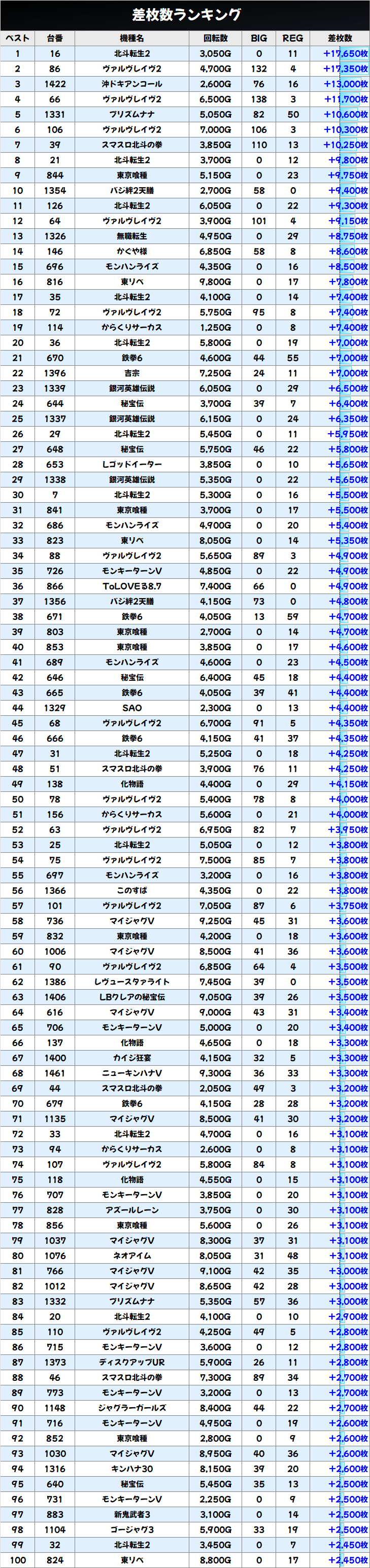 北斗転生2から+17650枚、ヴァルヴレイヴ2からは+17350枚を筆頭に万枚オーバーが3台出現しました。また、末尾⑥番台からはレインボートロフィーの出現情報もあったようでした!