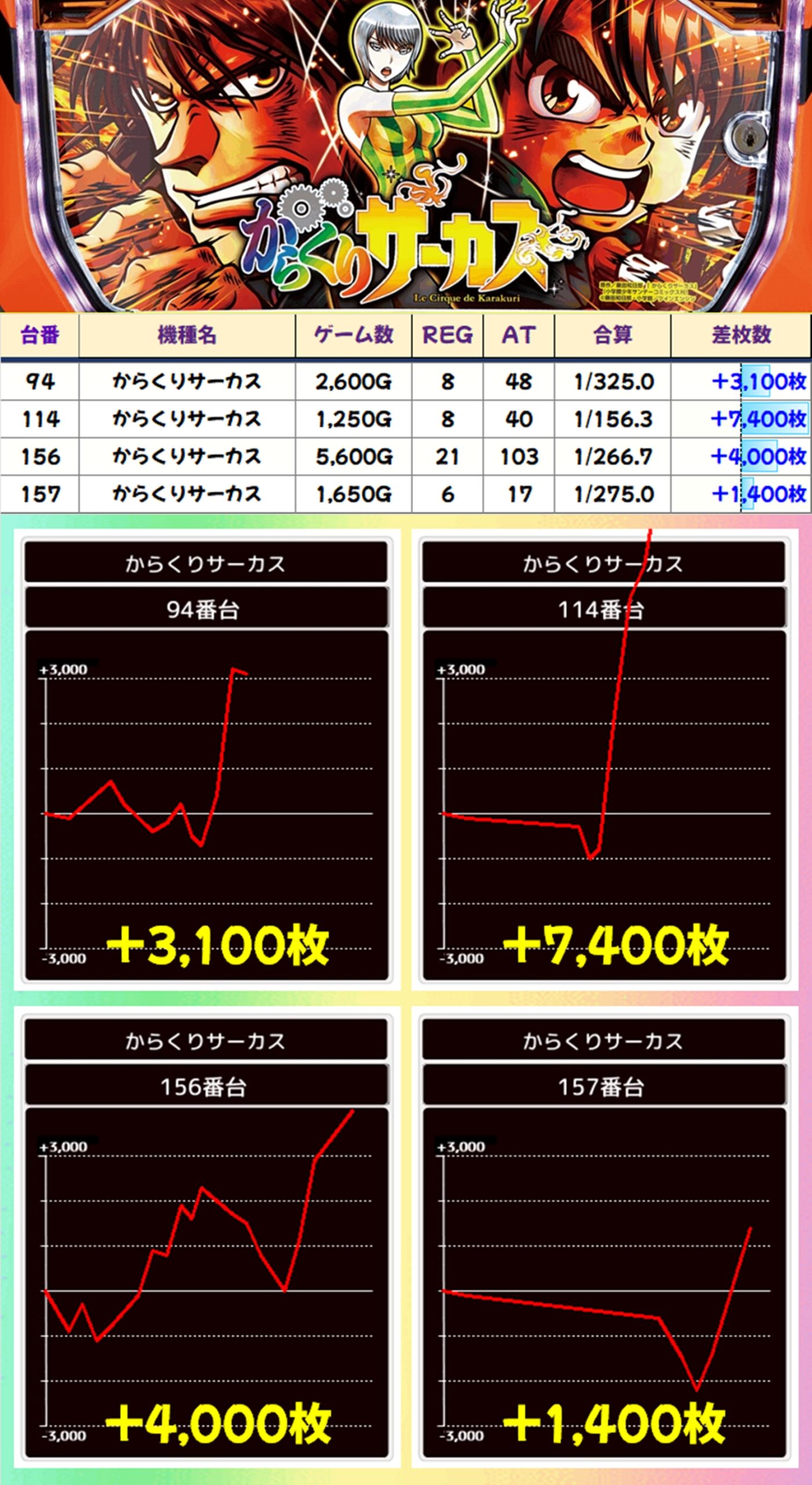 からくりサーカスは+7400枚の爆発台に加えて、+4000枚、+3100枚の優秀な出玉を確認!