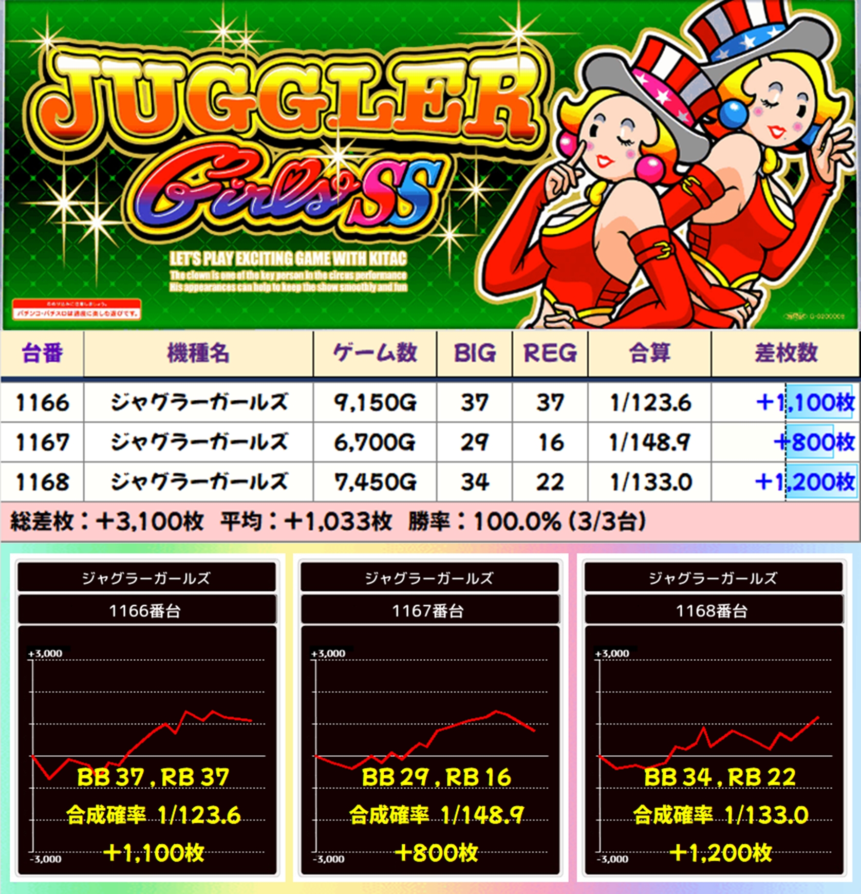 【3台並び】ジャグラーガールズ(1166-1168番台)→平均+1,033枚