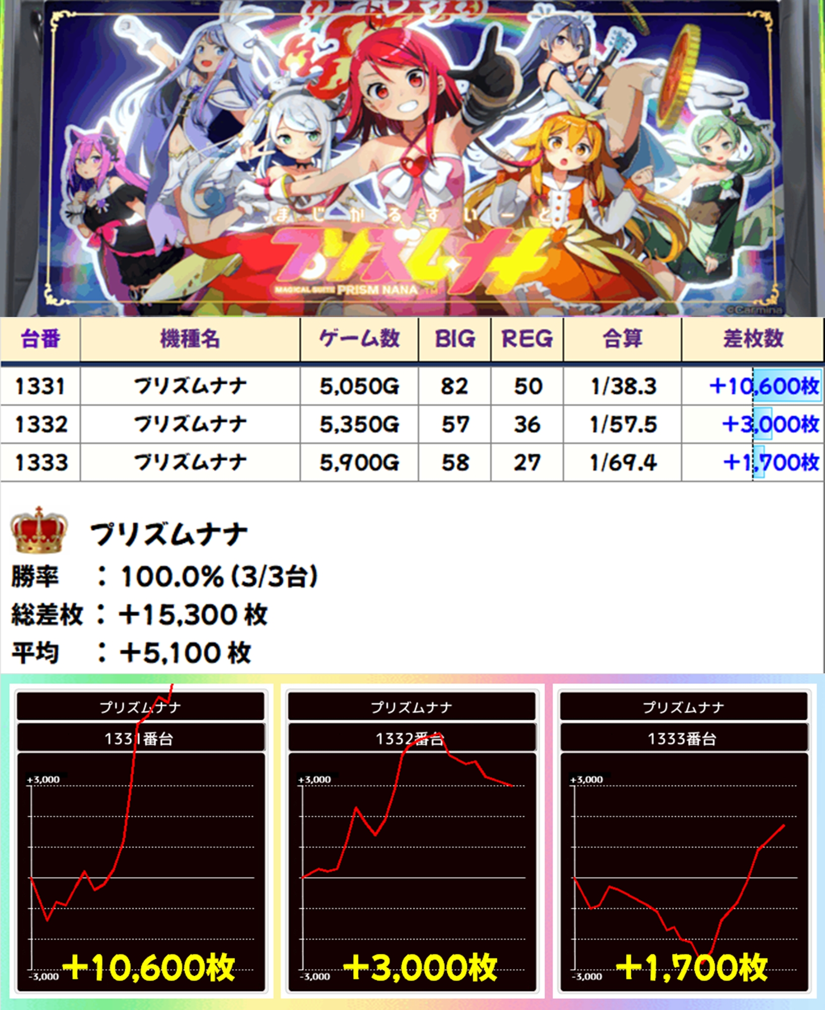 プリズムナナも4Fの機種でかぶぱポストにヒントがありました。こちらは+10600枚の万枚オーバーが飛び出し、3台全てがプラスに。銀河英雄伝説と同様に平均+5000枚を超える見事な結果を残しました!