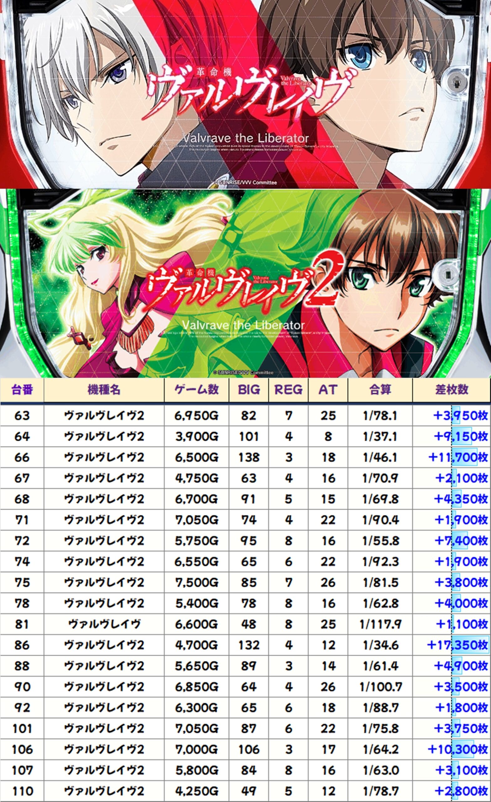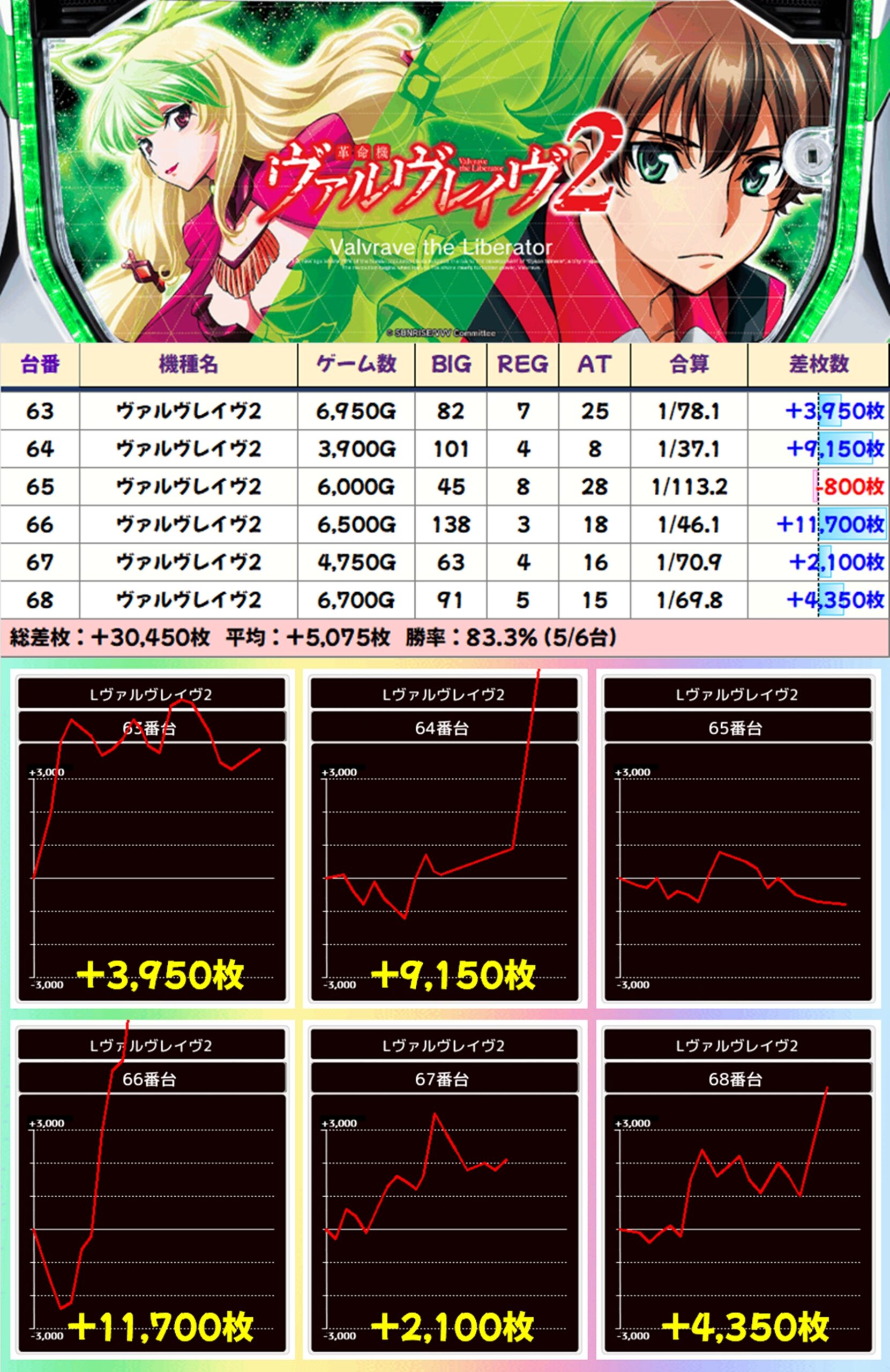 【6台並び】ヴァルヴレイヴ2(63-68番台)→平均+5,075枚