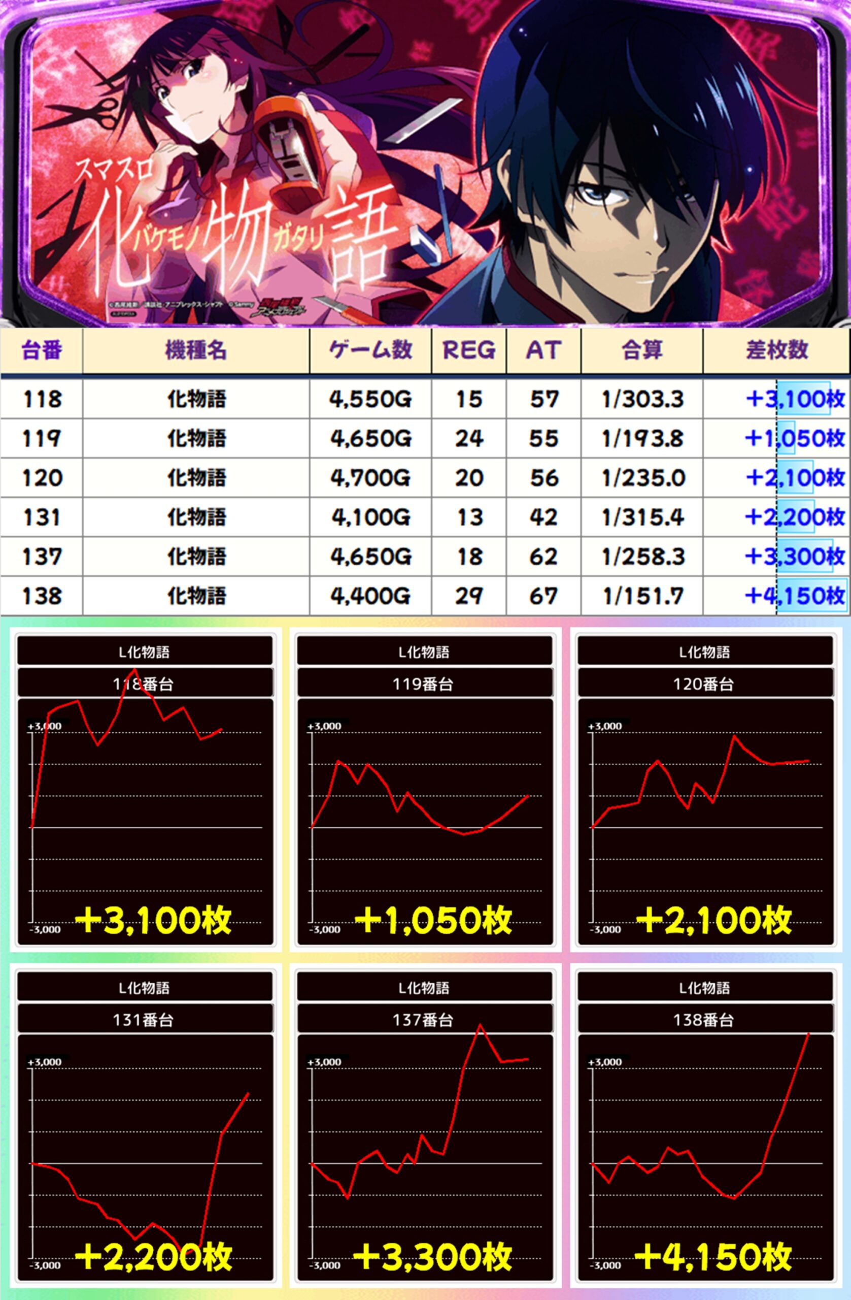 3台並びの仕掛けがあった化物語ですが、並び以外からも+4150枚や+3300枚などの大量出玉を確認できました!