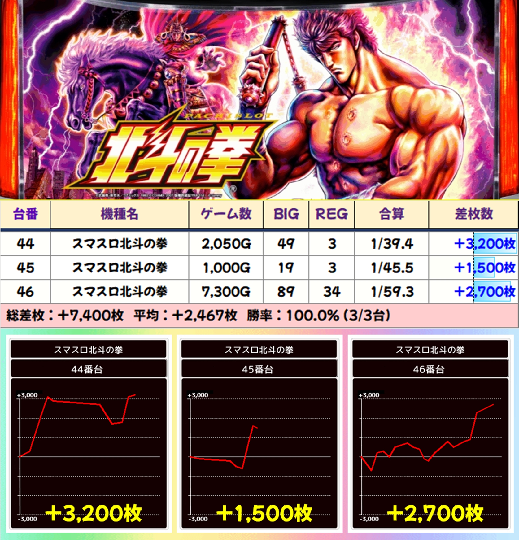 【3台並び】スマスロ北斗の拳(44-46番台)→平均+2,467枚