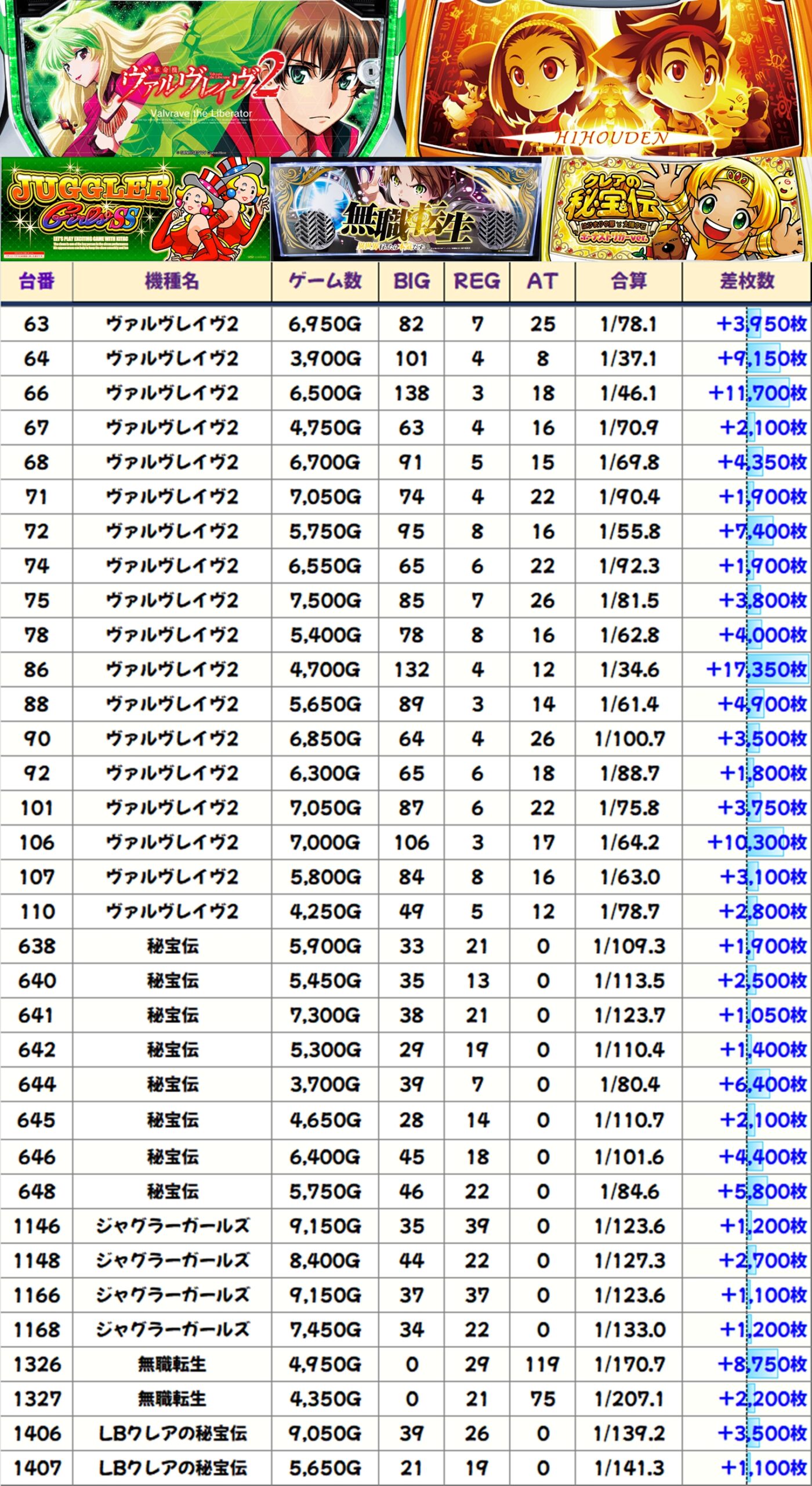 ヴァルヴレイヴ2は末尾⑥番台も絡んでおり、不発が1台ありましたが、平均+5000枚を超える好結果に。秘宝伝と化物語はいずれも全台がプラスとなっておりました!