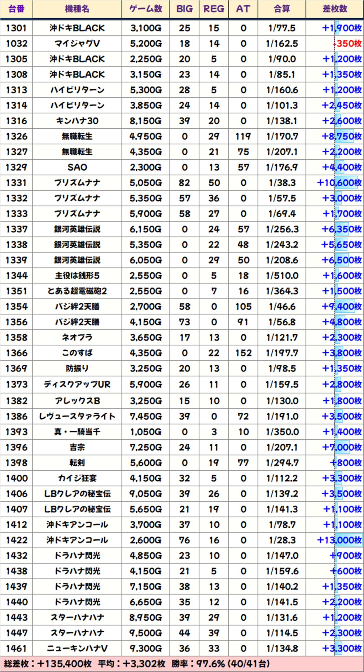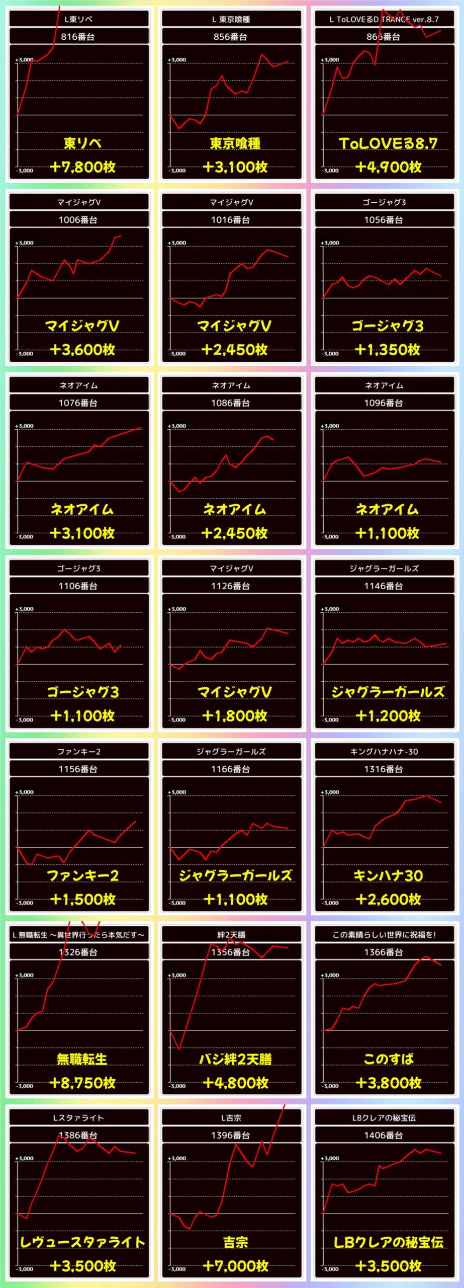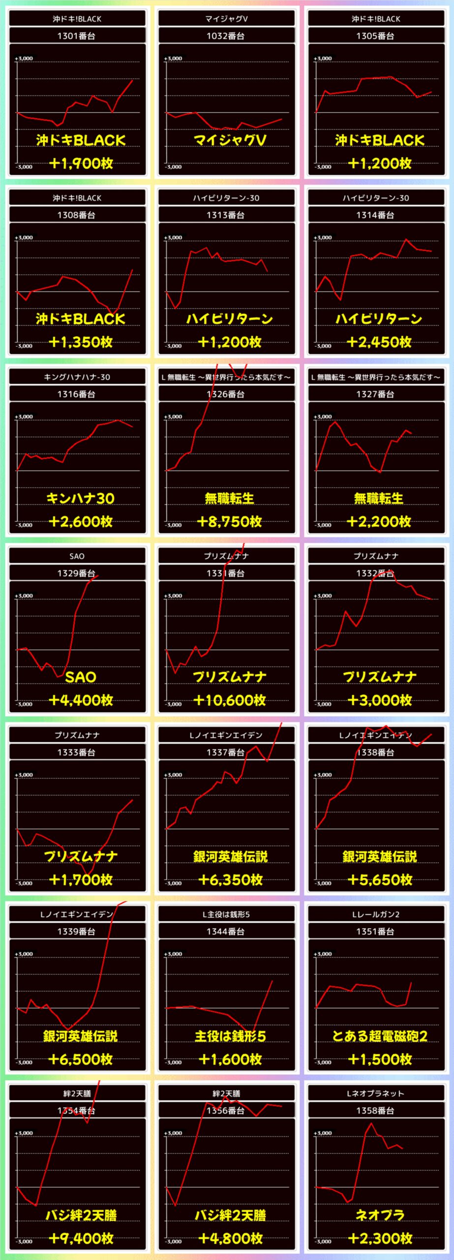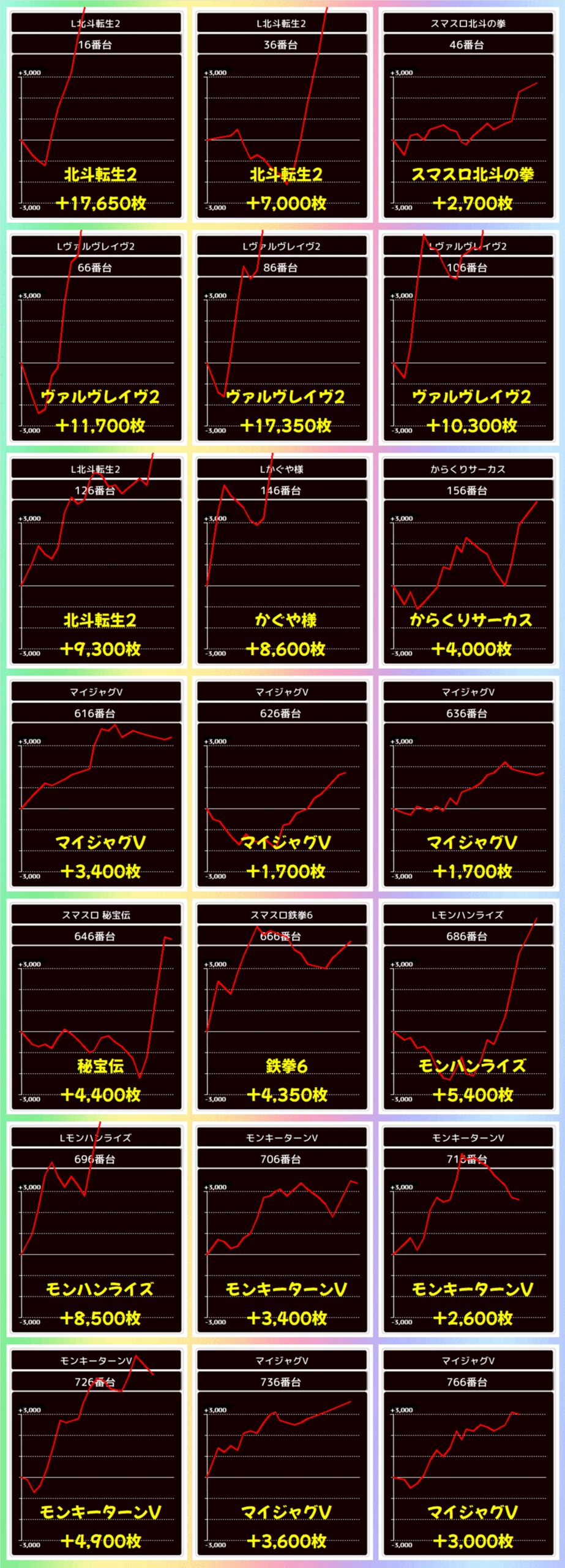 いずれの機種も末尾⑥番台が絡んでおりましたが、末尾⑥番台以外からも優秀な出玉を多数確認することができました。