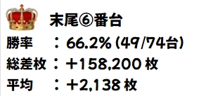 6のつく日におなじみの末尾⑥の仕掛けは、総差枚+158200枚となり、平均+2138枚という見事な結果に!