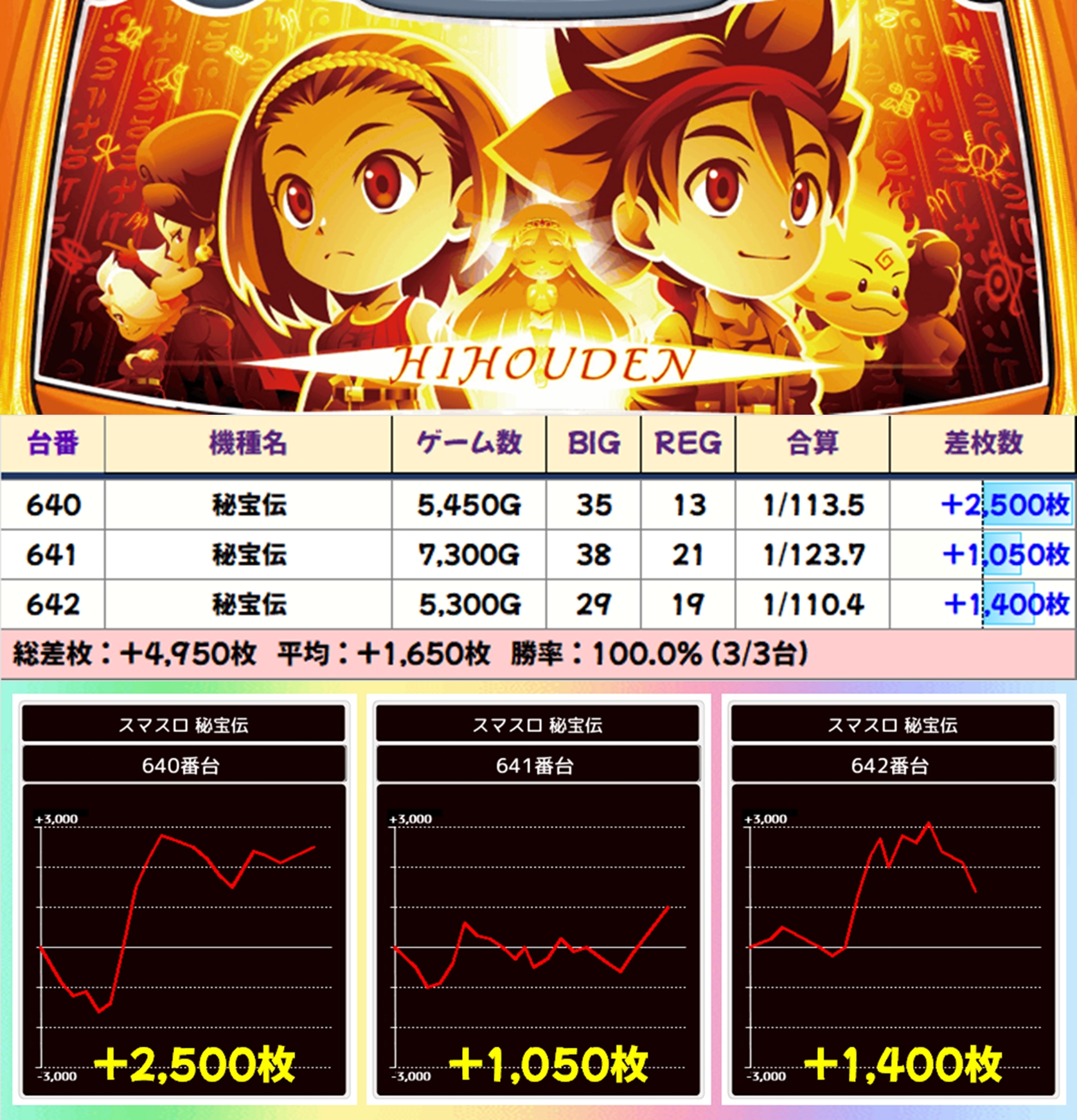 【3台並び】秘宝伝(640-642番台)→平均+1,650枚