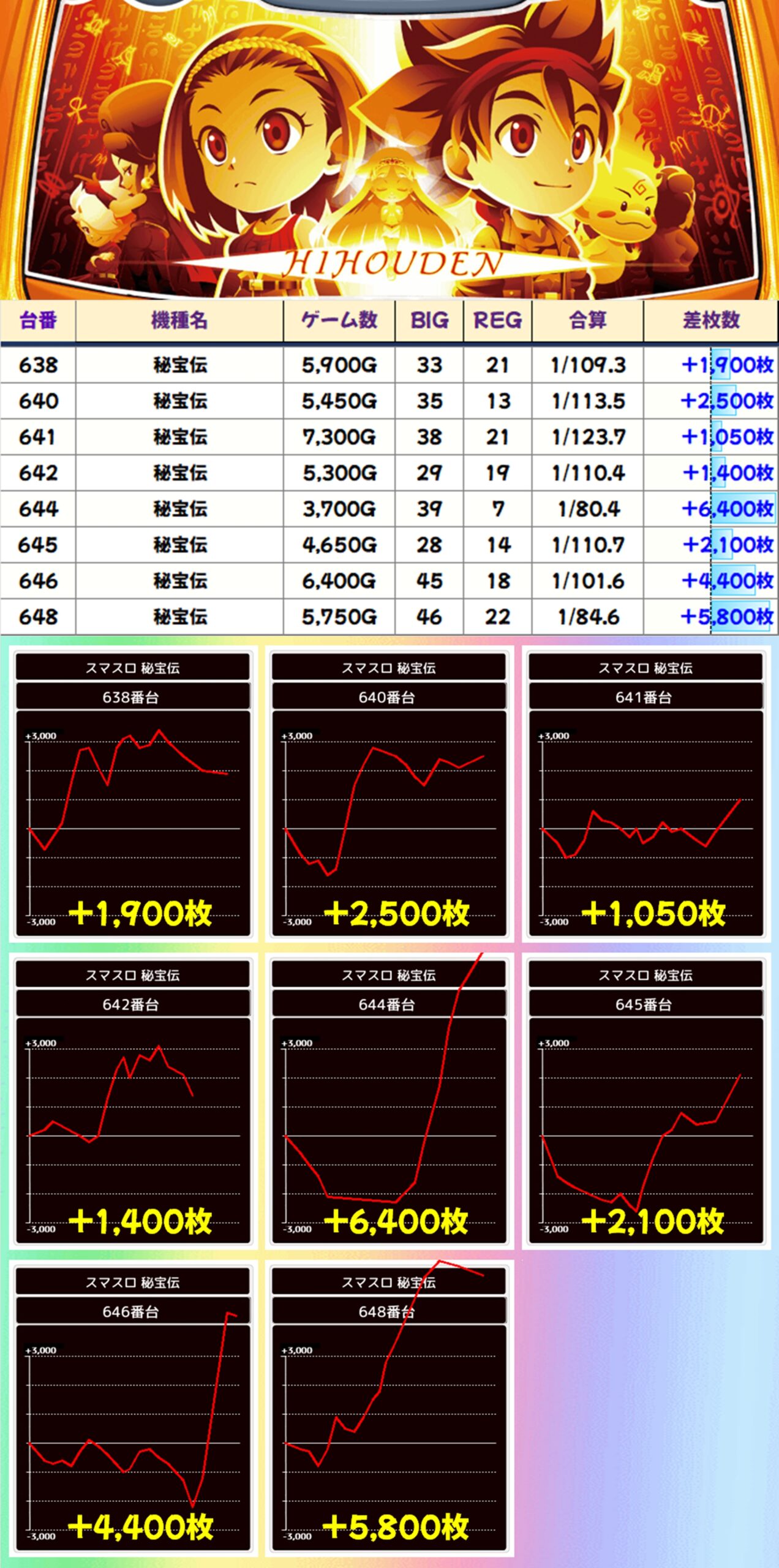 1/2系濃厚の仕掛けと並びの仕掛けがあった秘宝伝は+6400枚や+5800枚など優秀な出玉が多数出現!