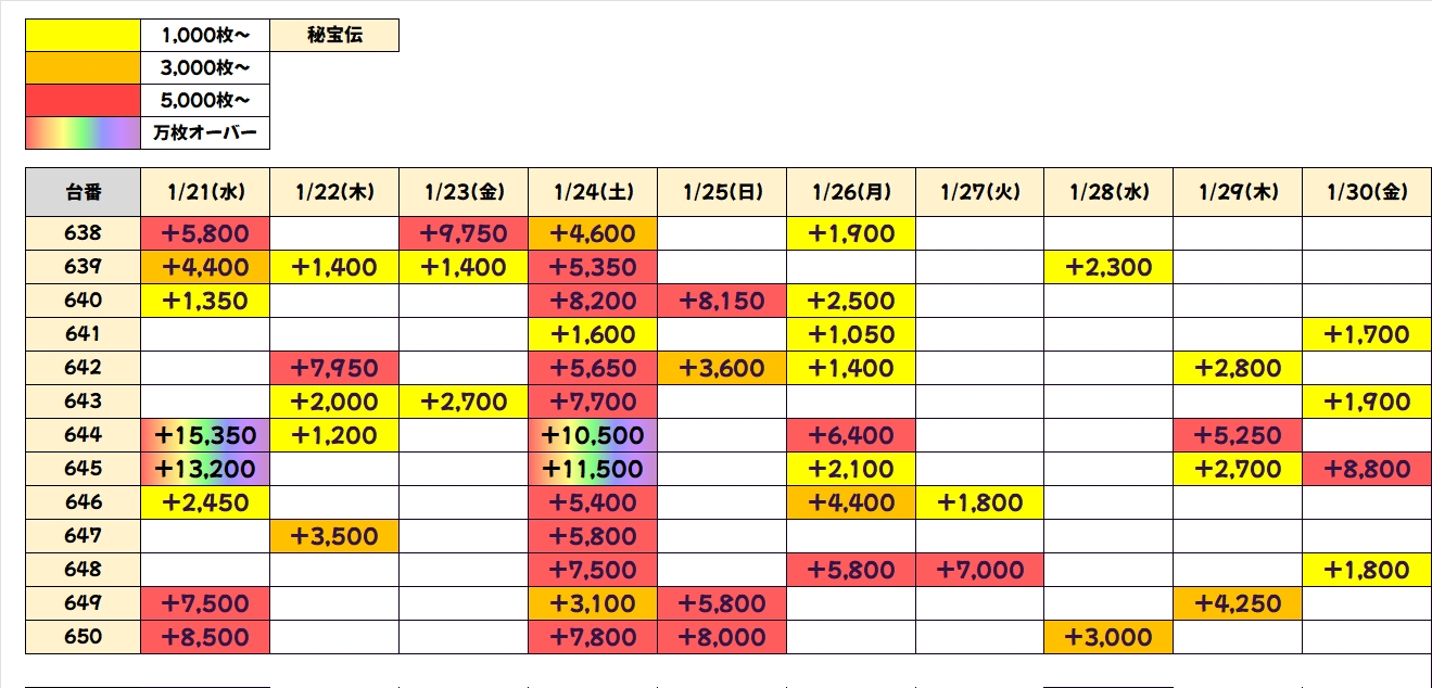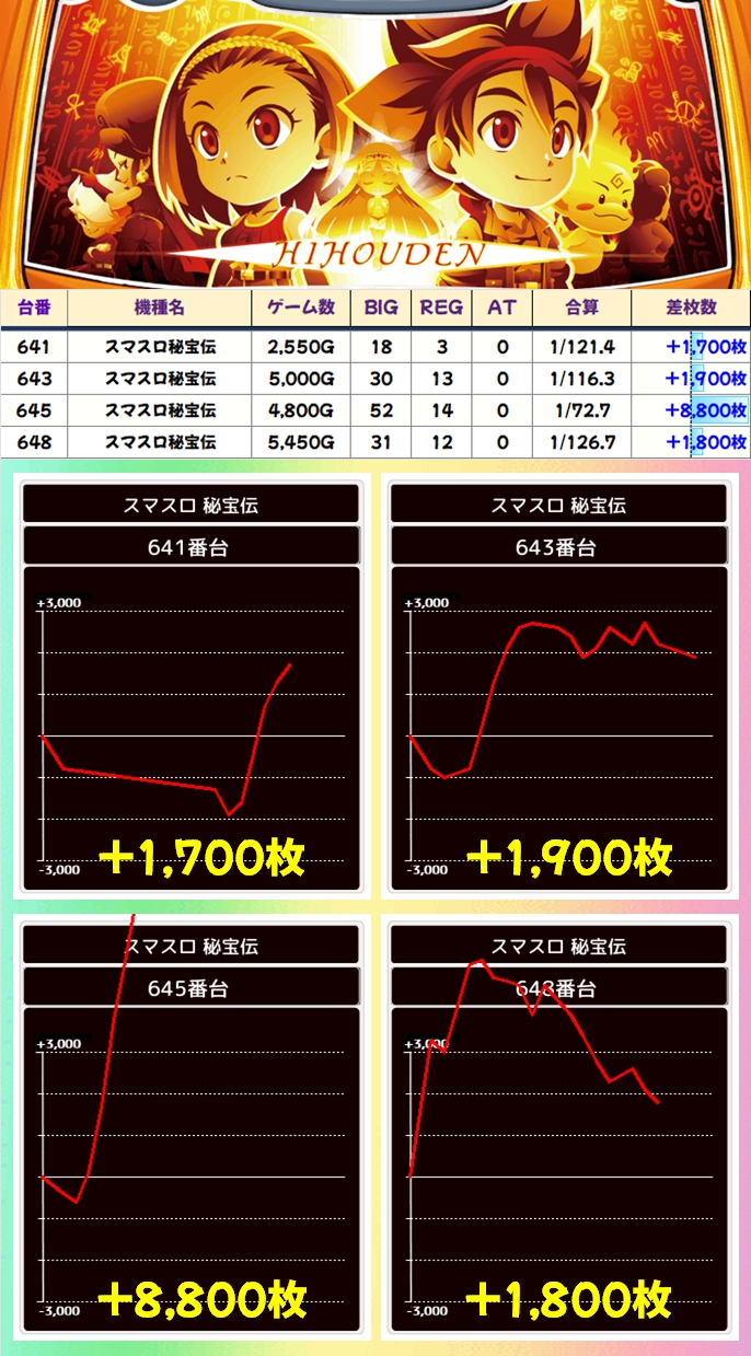 ⓪の日機種だった秘宝伝からは優秀台を複数確認でき、+8000枚overの爆出し台も出現!