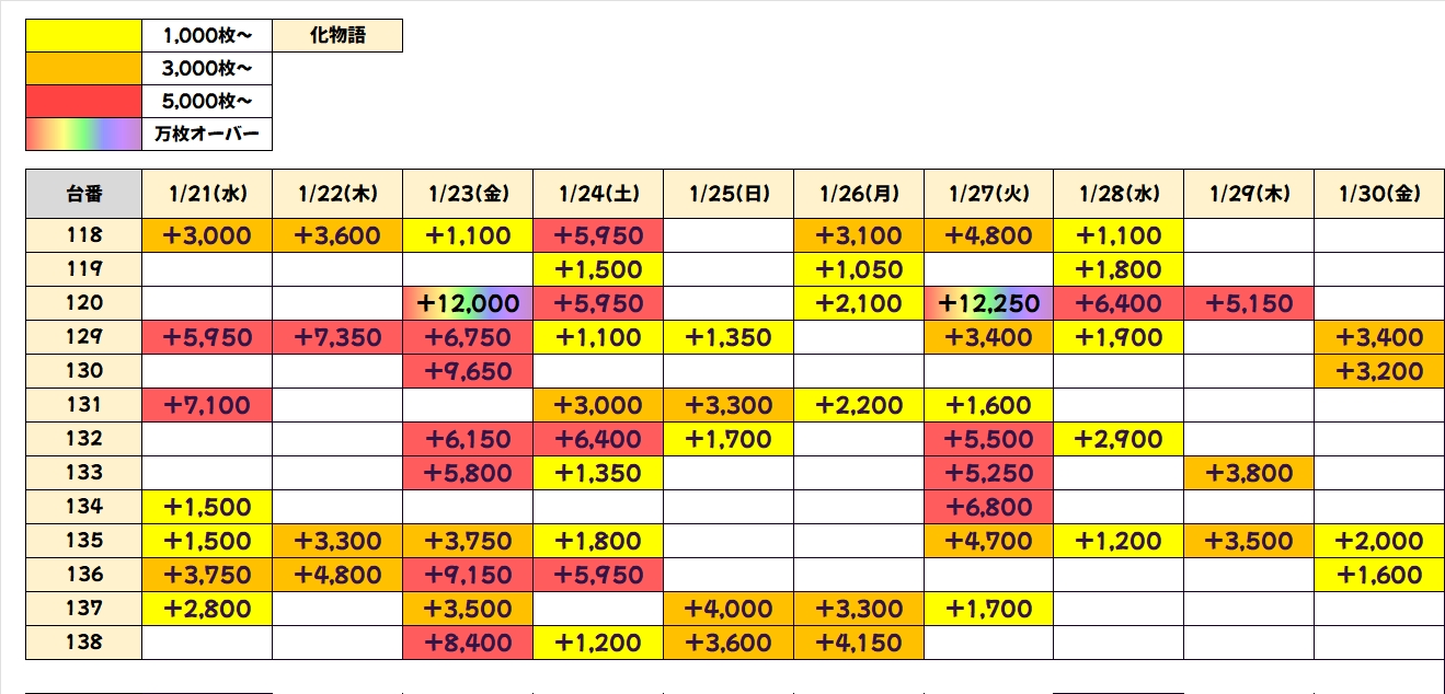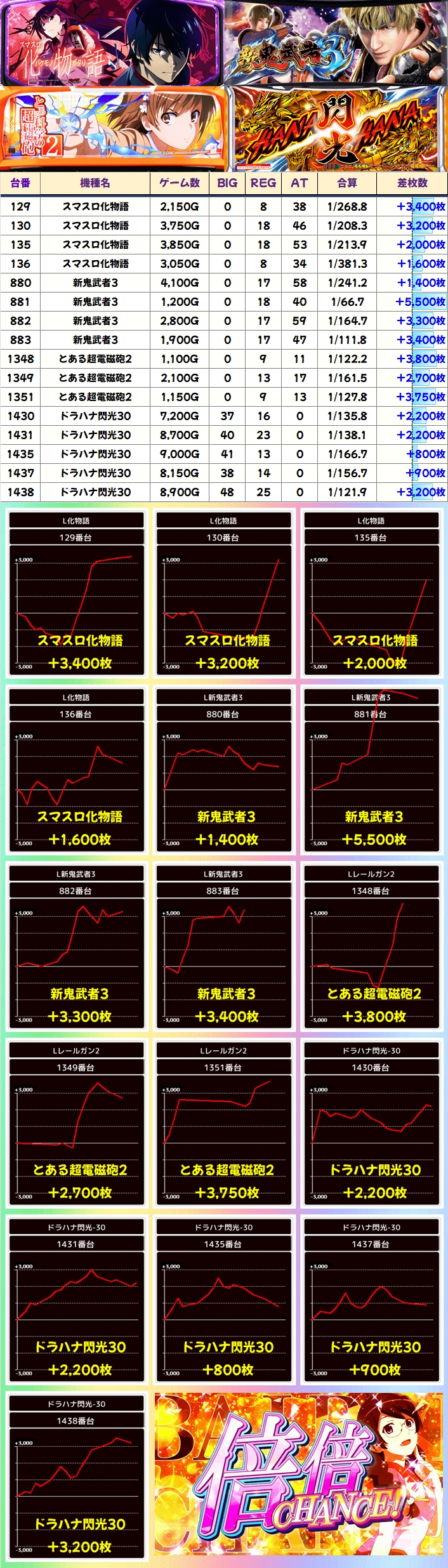 化物語も連日好調の状況が続いており、本日も+3000枚overと+2000枚overを複数確認することができました!
