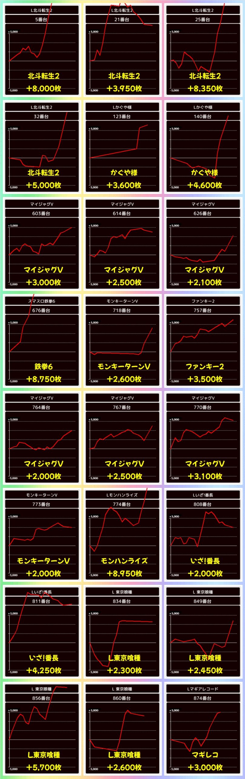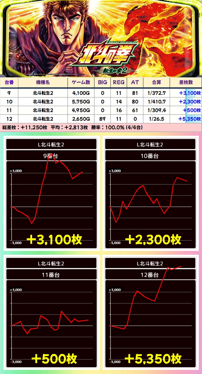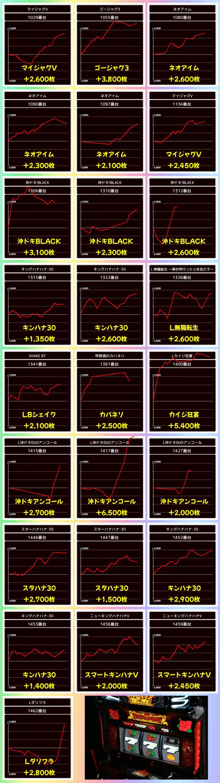 上記の機種からは大量出玉も確認でき、新鬼武者3から+5000枚over台が出現していました!