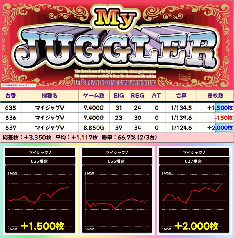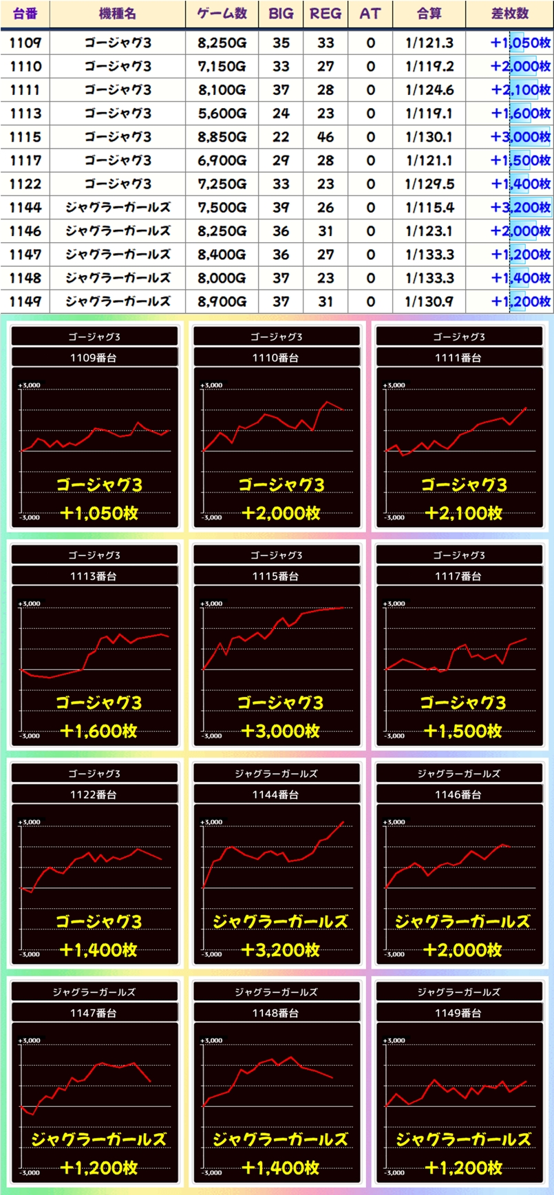 5の日なのもあってジャグに高配分機種が複数あり!ゴージャグ&ガールズが優秀だったのは間違いないですが、これら以外もジャグは全シリーズプラス差枚でした!