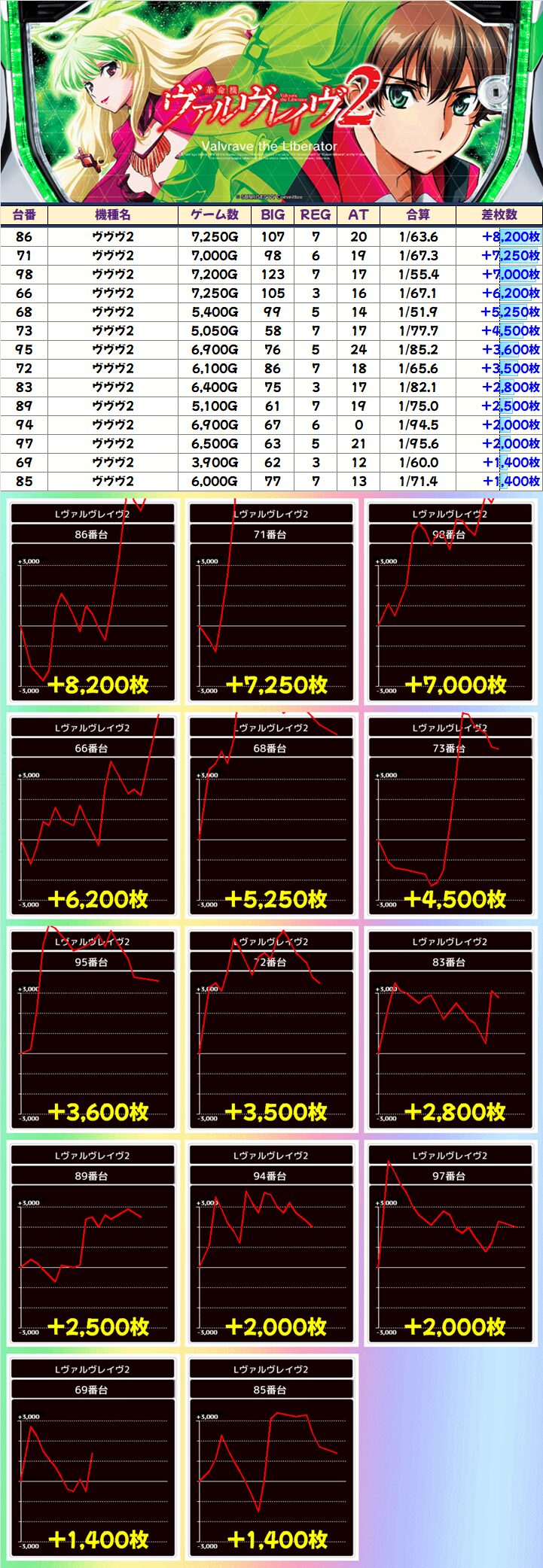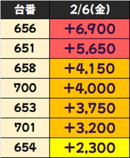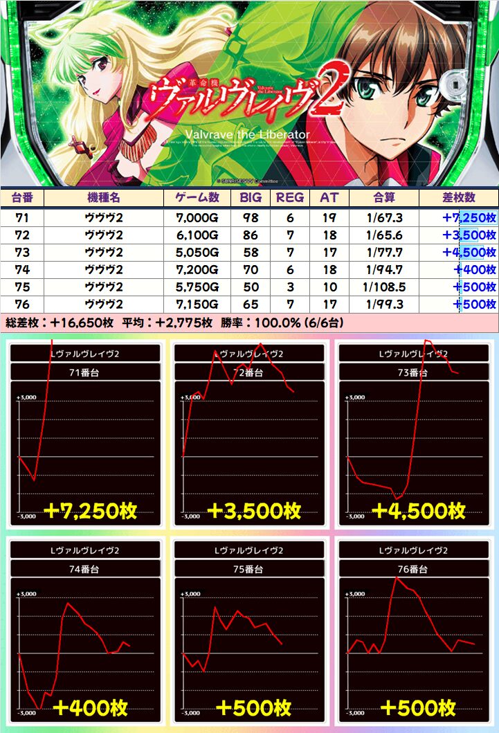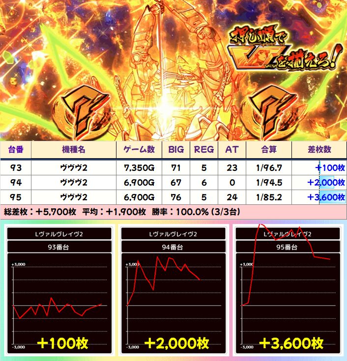 3台以上並びが複数あった「ヴァルヴレイヴ2」ですが、+5000枚以上×5台など計14台が+1000枚以上と素晴らしい結果を残していました!