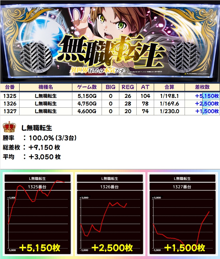 「L無職転生」の+5150枚を筆頭に全機種から+3000枚以上の優秀台を確認!