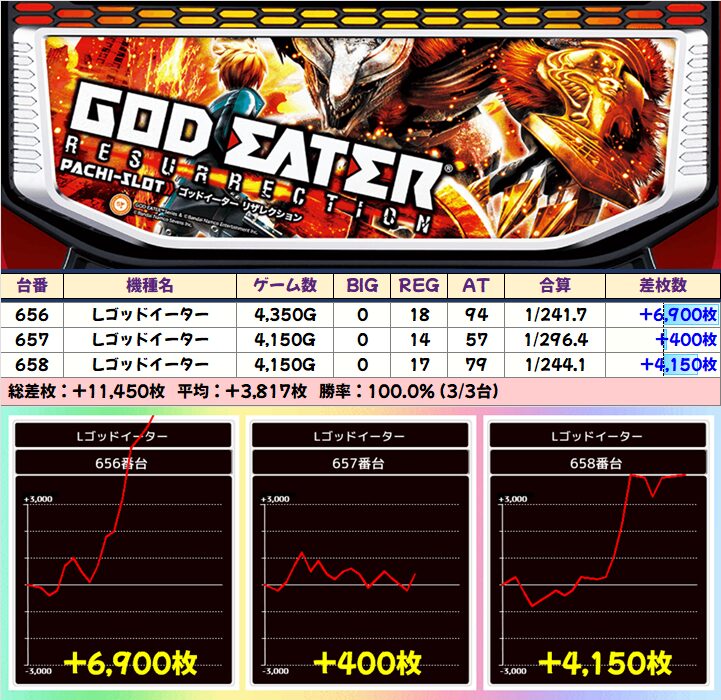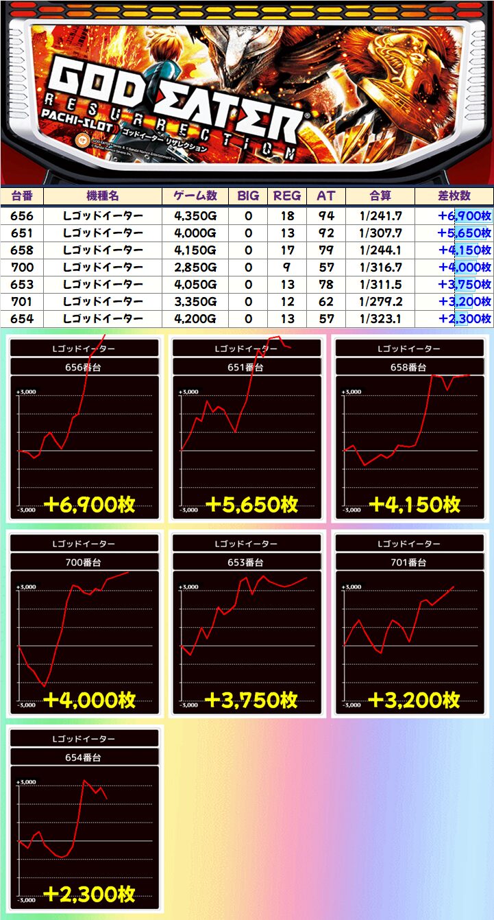 各機種から素晴らしい台が続出していますが、中でも2/1から登場した新ポスター機種「ゴッドイーター」は+6900枚を筆頭に14台中6台と半数近い台が+3000枚以上と抜群でした!