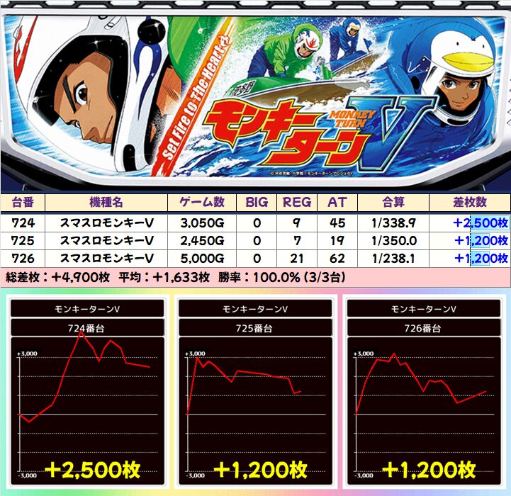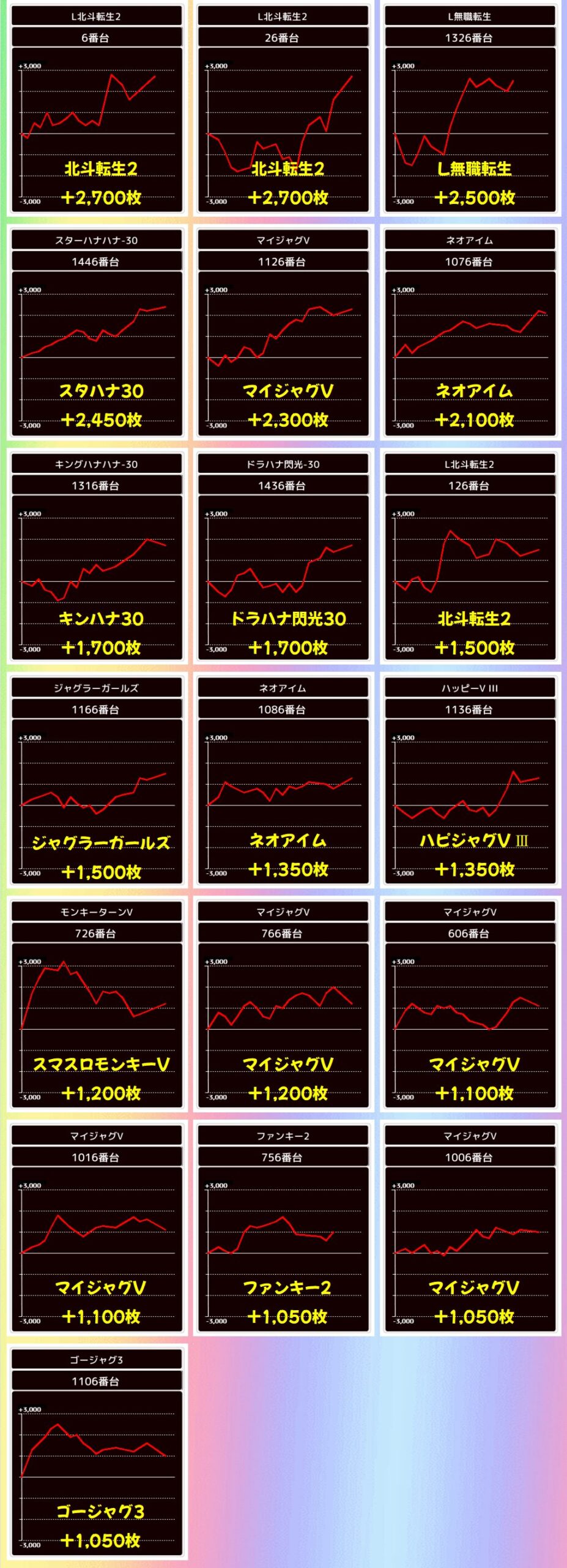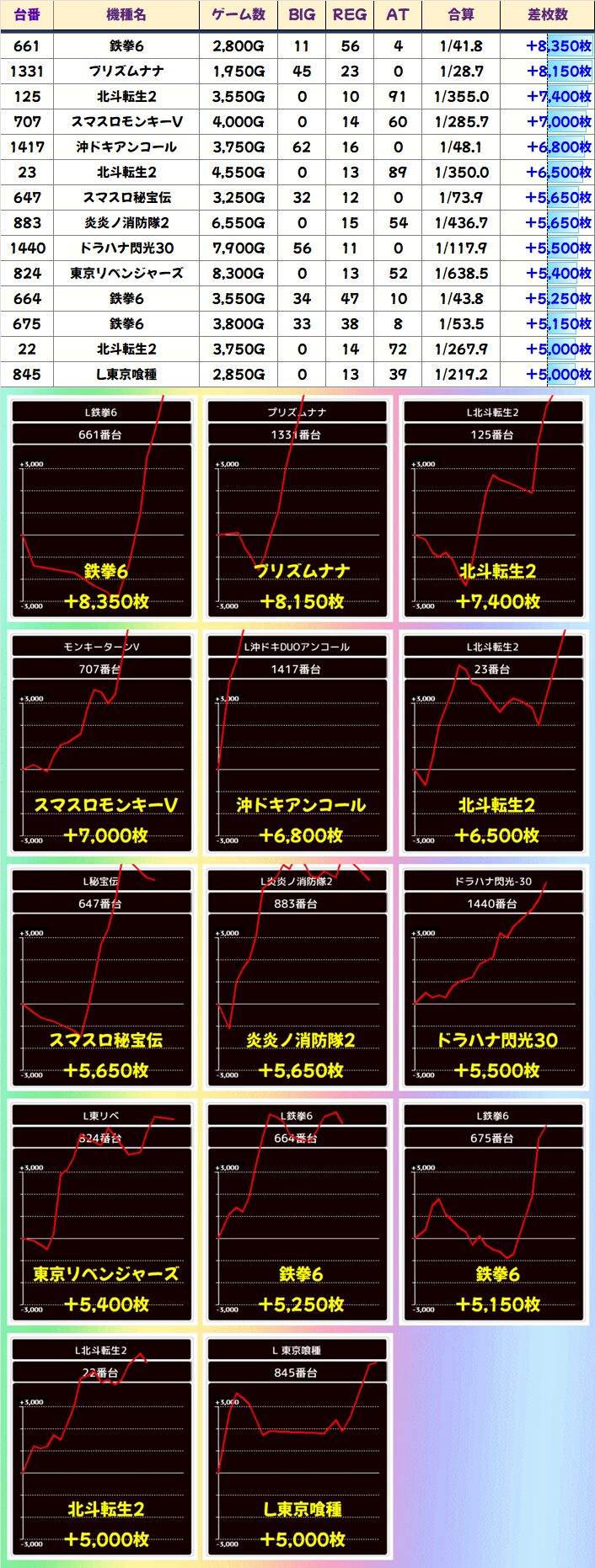 +3000枚以上×3台を筆頭に全7台が+1000枚以上と圧倒的な結果に!