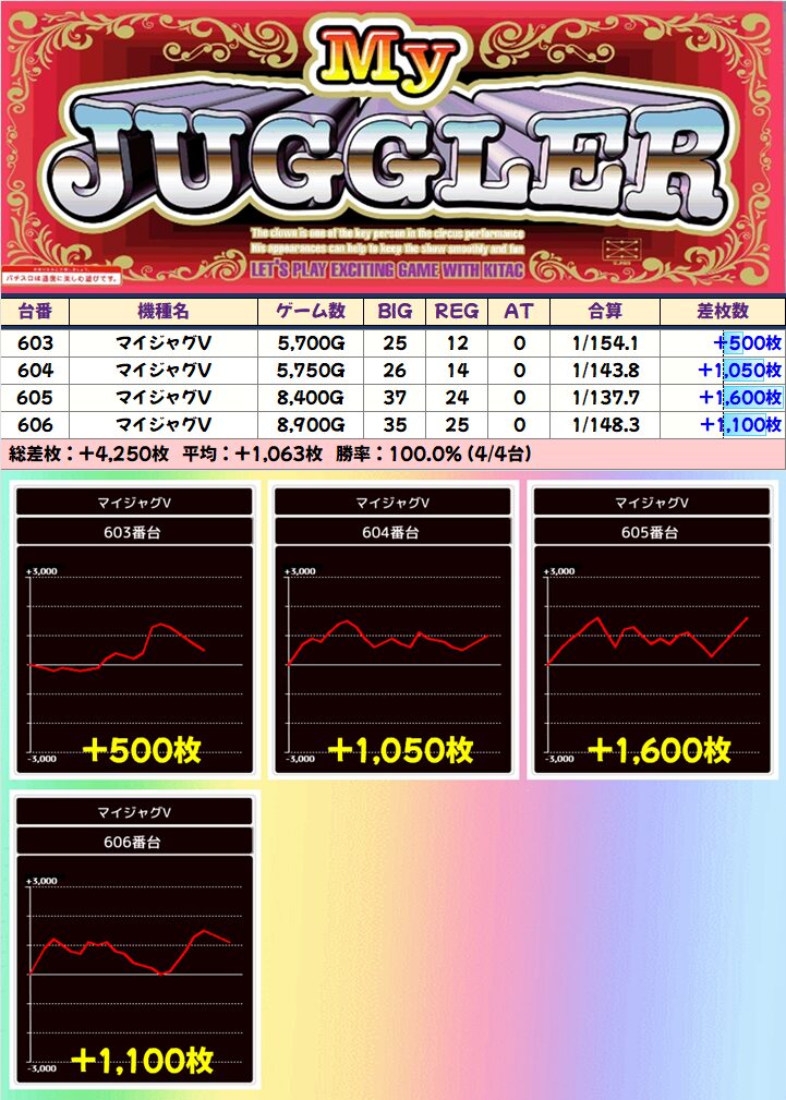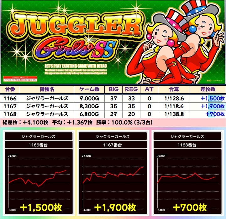 ■ジャグラーガールズ(6/11台+)➡平均+386枚