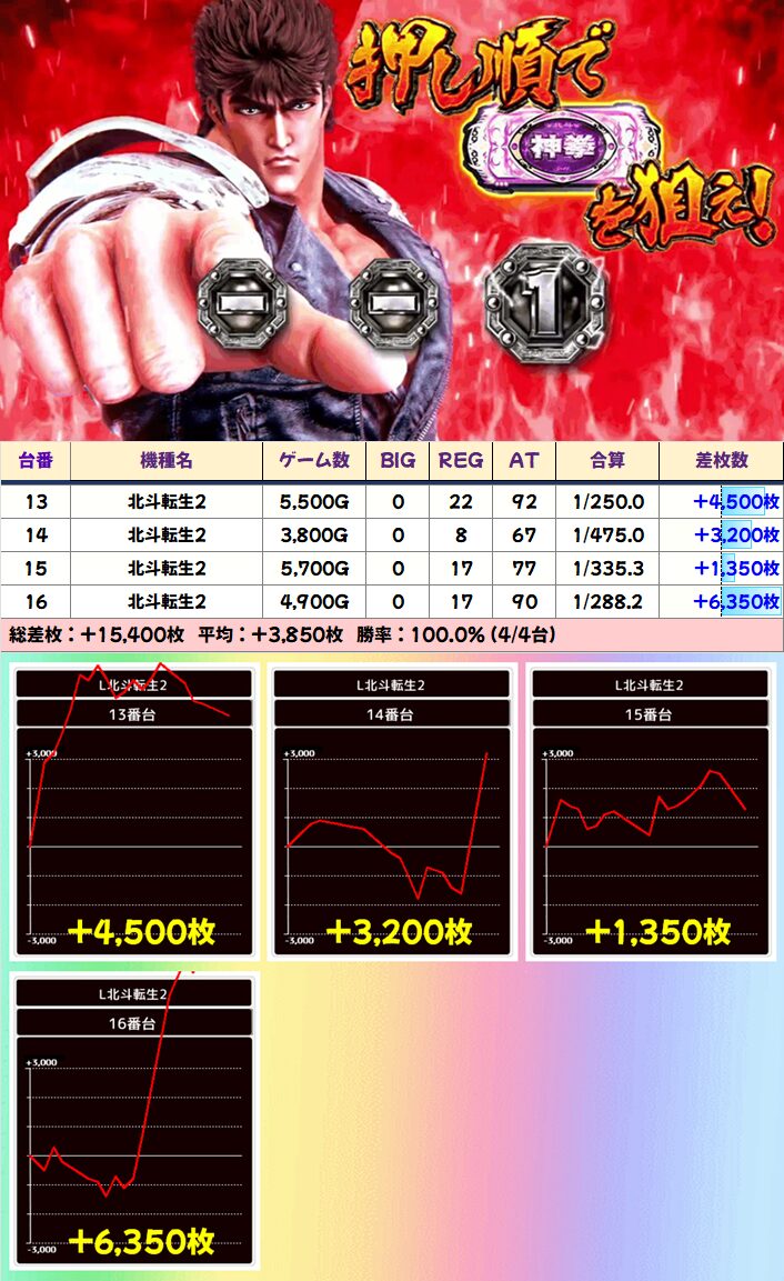 この日は前述した仕掛け以外にも、「北斗転生2」の+5000枚以上×3台など大量の単品優秀台を確認!