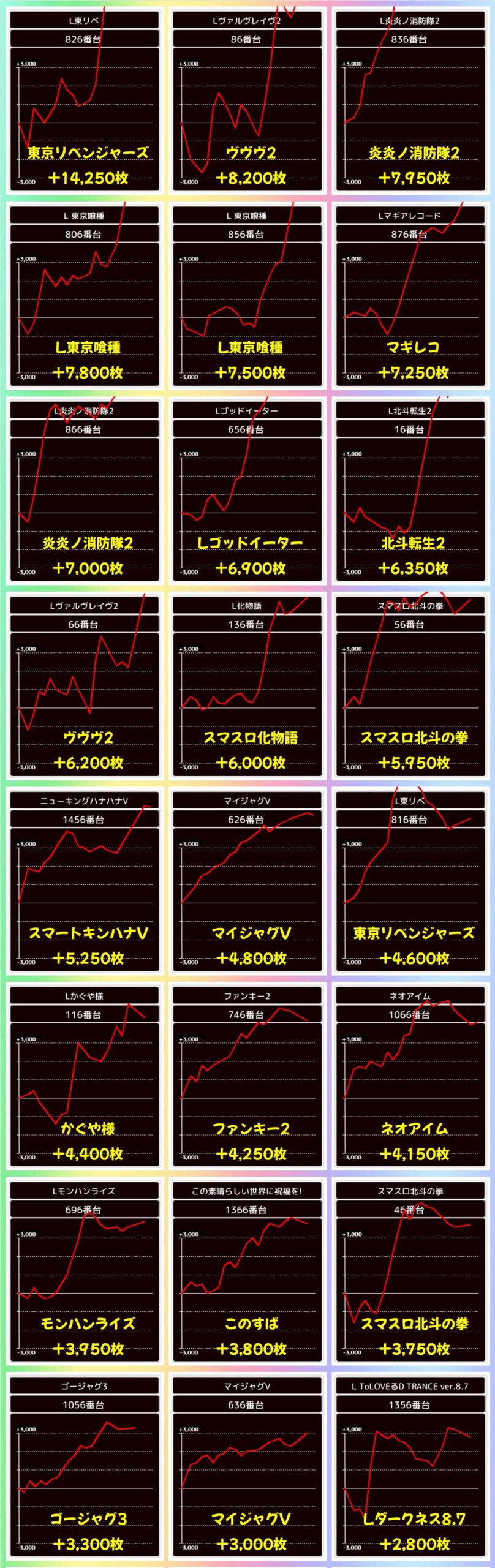 末尾⑥番台からは「東京リベンジャーズ」の+14000枚以上を筆頭に43台もの台が+1000枚以上の出玉が出現!