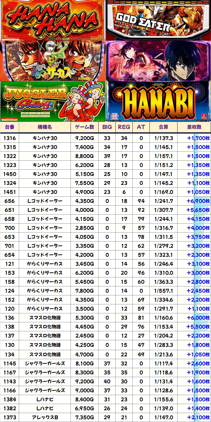 今回も優秀台(+1000枚超)をピックアップしましたので見ていきましょう!