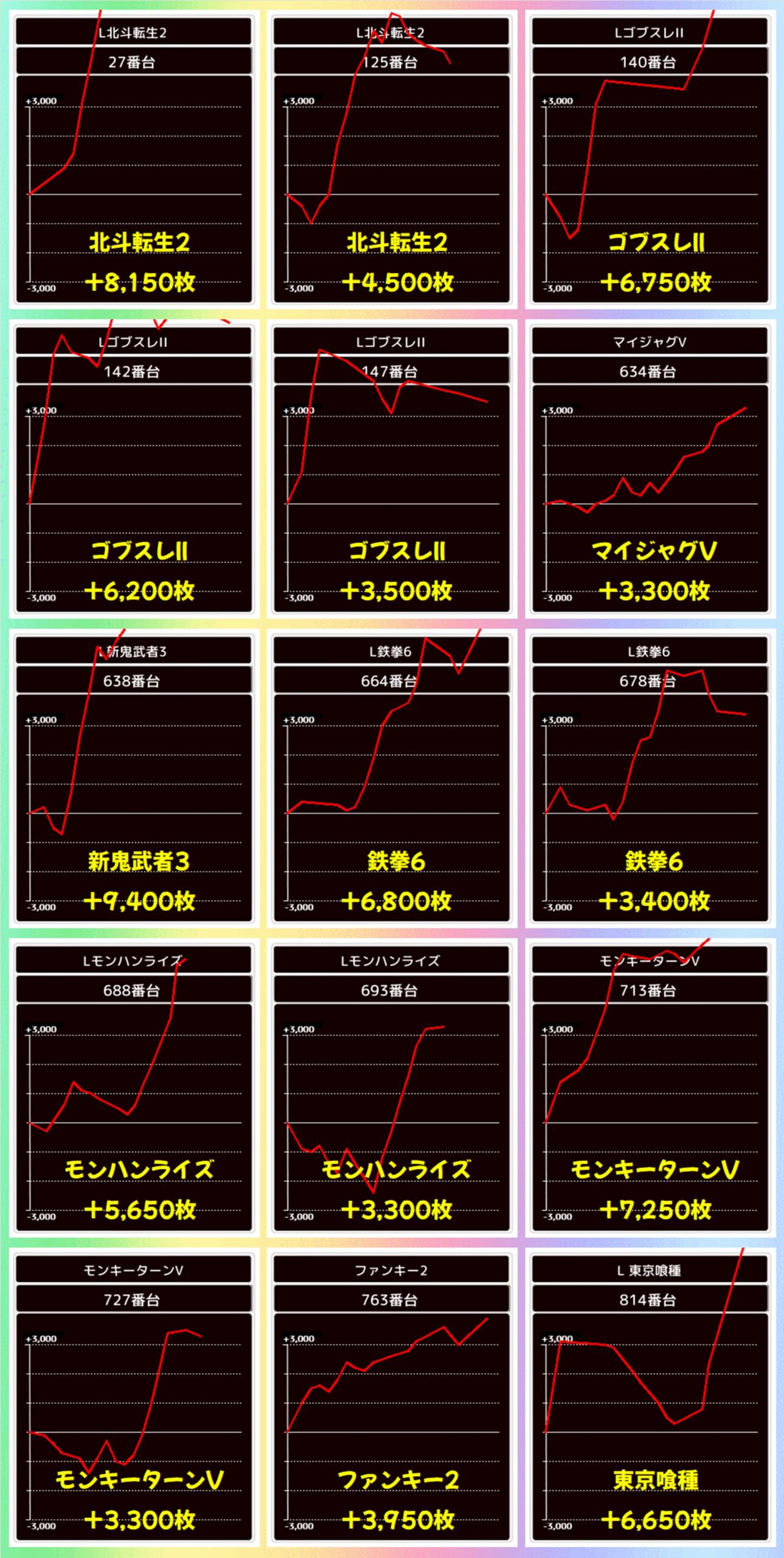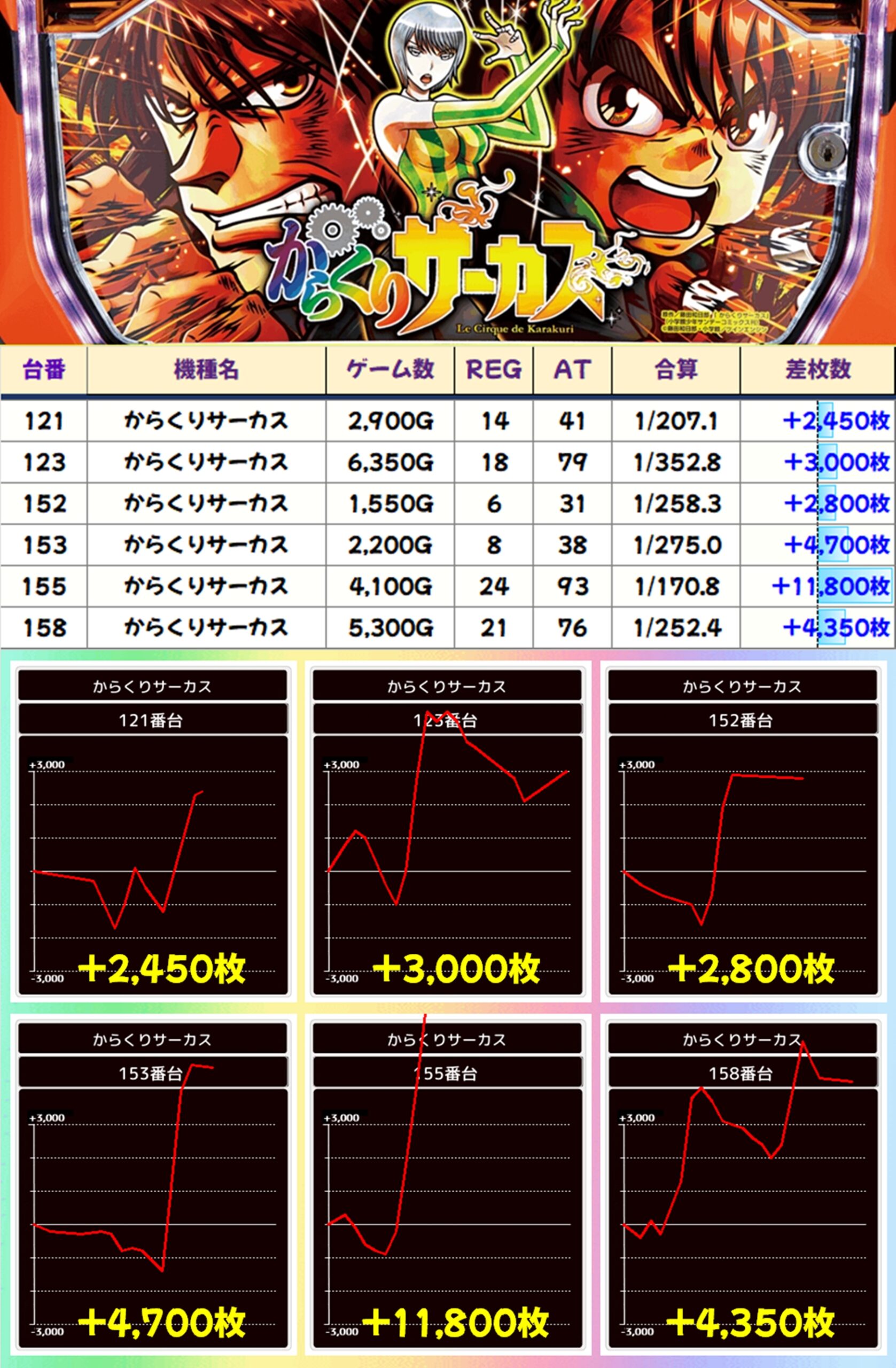 からくりサーカスからは+11800枚の万枚オーバーが出現。その他にも優秀な出玉が多数出現しました!