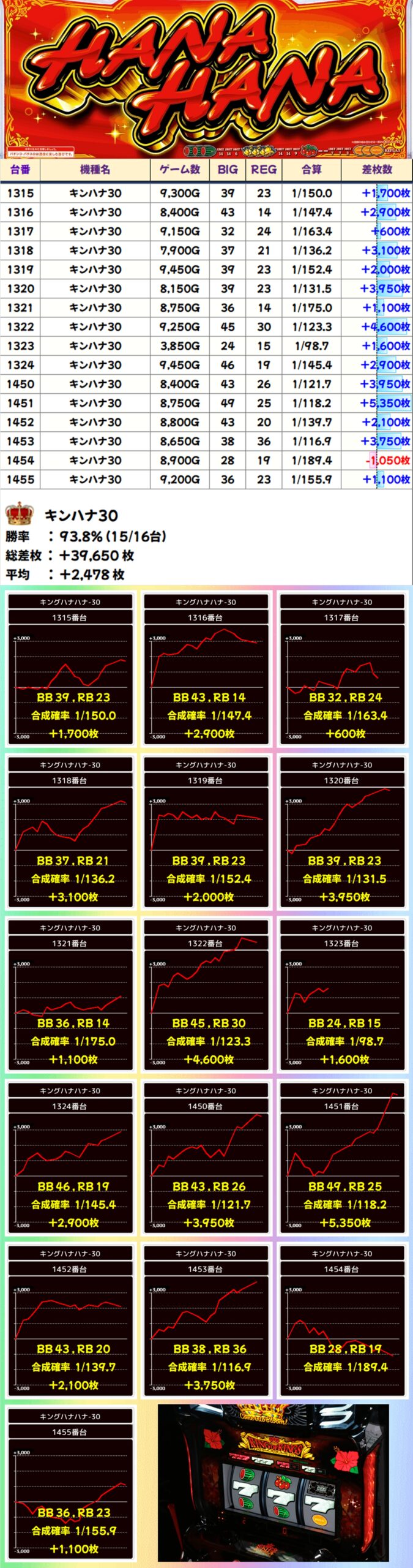 かぶぱポストにダブルでヒントがあったキンハナ30が全台系濃厚となり、16台中15台がプラスに。大量出玉も確認でき、平均+2500枚弱という見事な結果となりましたね!