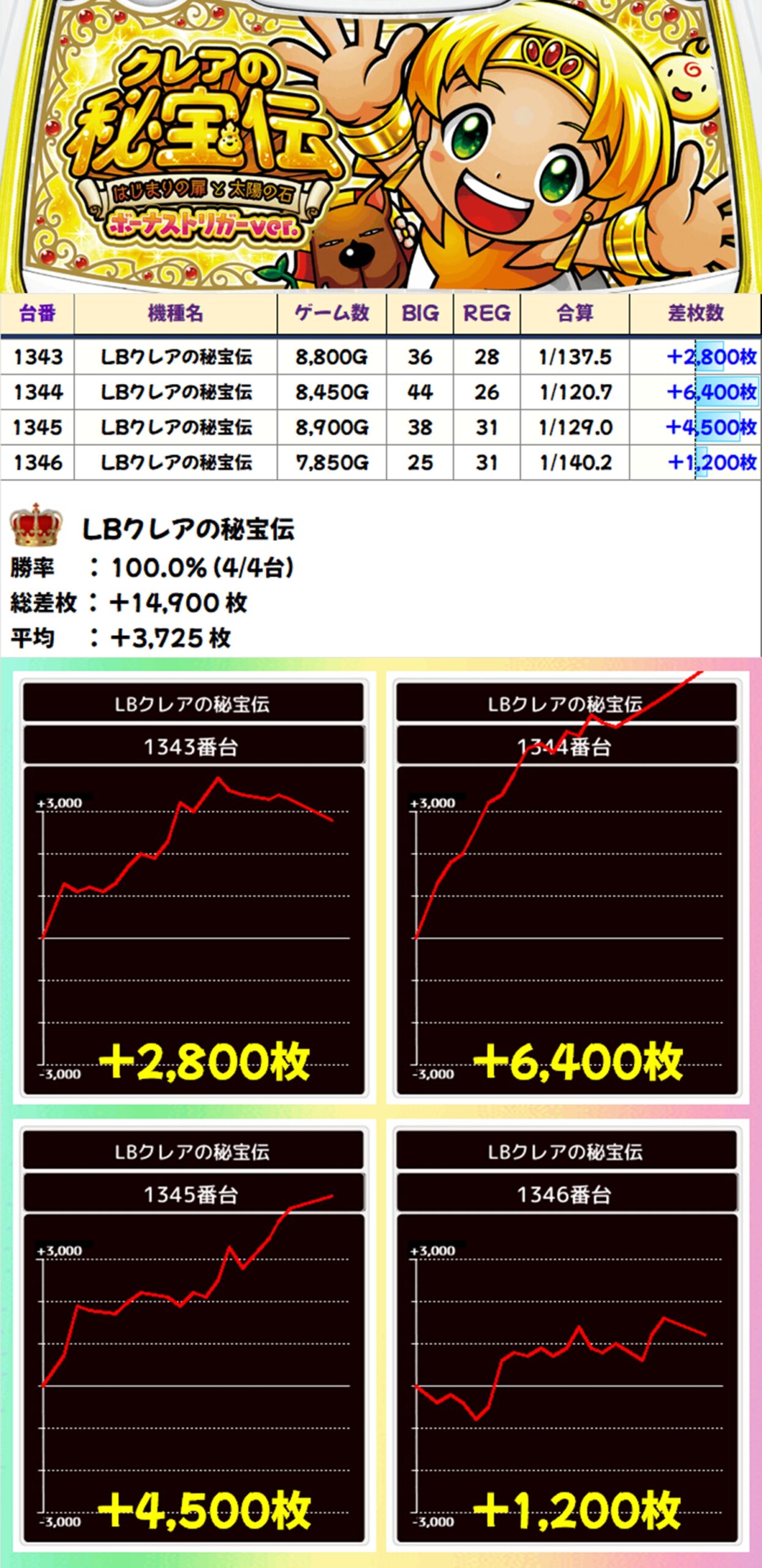 大都機種のLBクレアの秘宝伝もかぶぱポストにヒントがあった機種で、こちらは4台全てがプラス差枚に。+6400枚や+4500枚といった大量出玉も確認することができました!