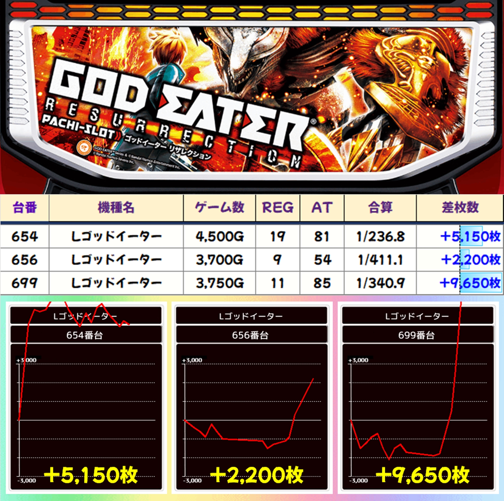 Lゴッドイーターからは+9650枚の大爆発や+5150枚といった優秀な出玉が出現!
