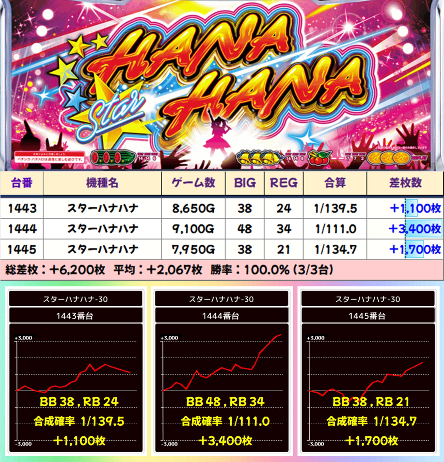 【3台並び】スターハナハナ(1443-1445番台)→平均+2,067枚