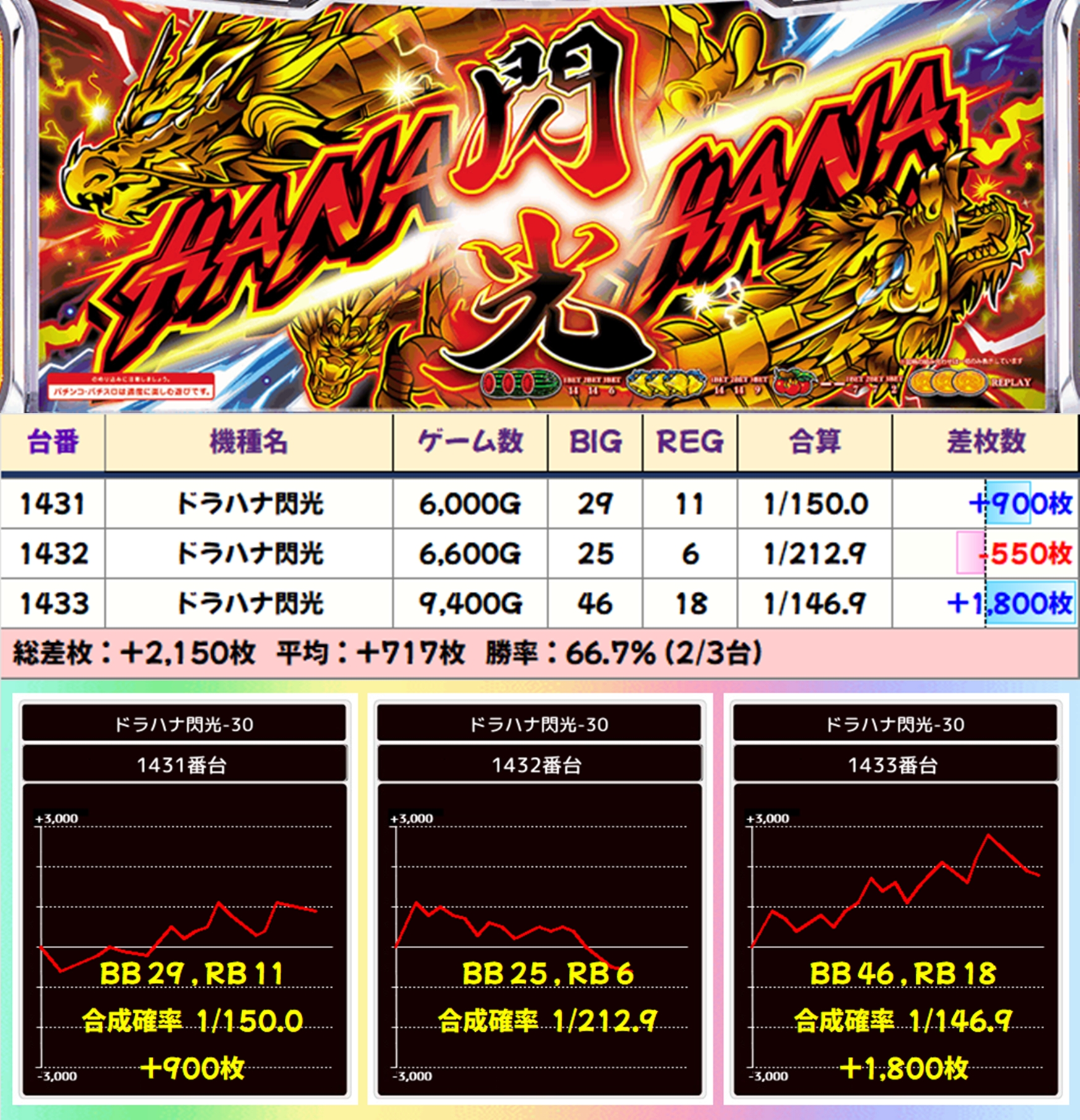 【3台並び】ドラハナ閃光(1431-1433番台)→平均+717枚