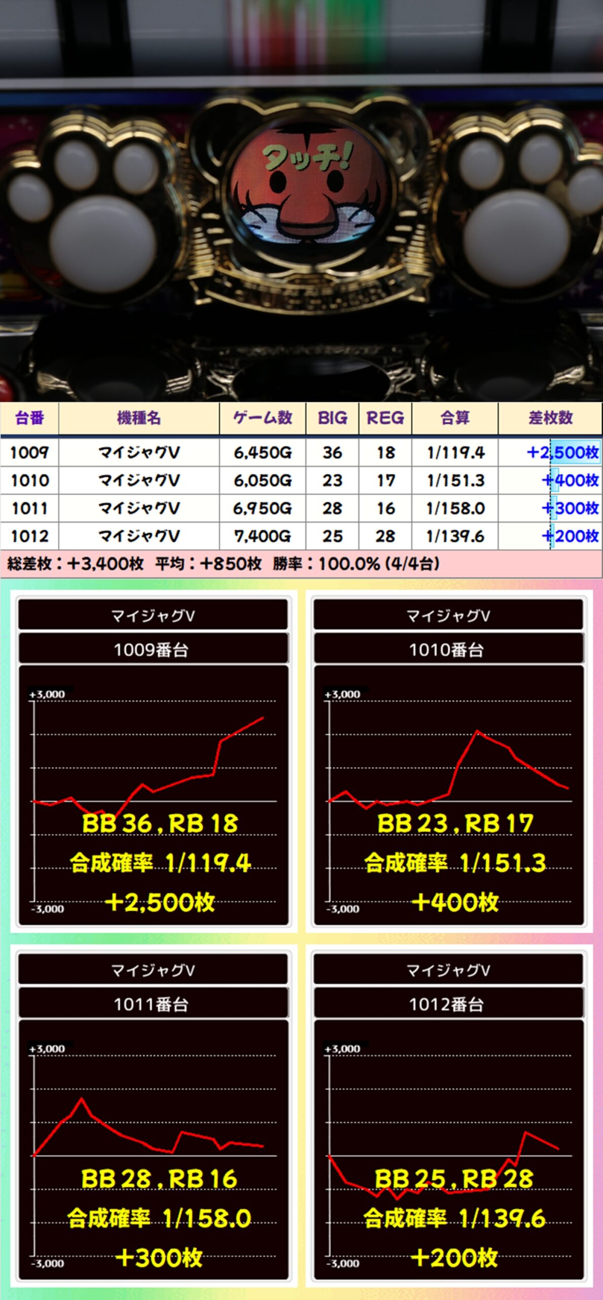 【4台並び】マイジャグV(1009-1012番台)→平均+850枚