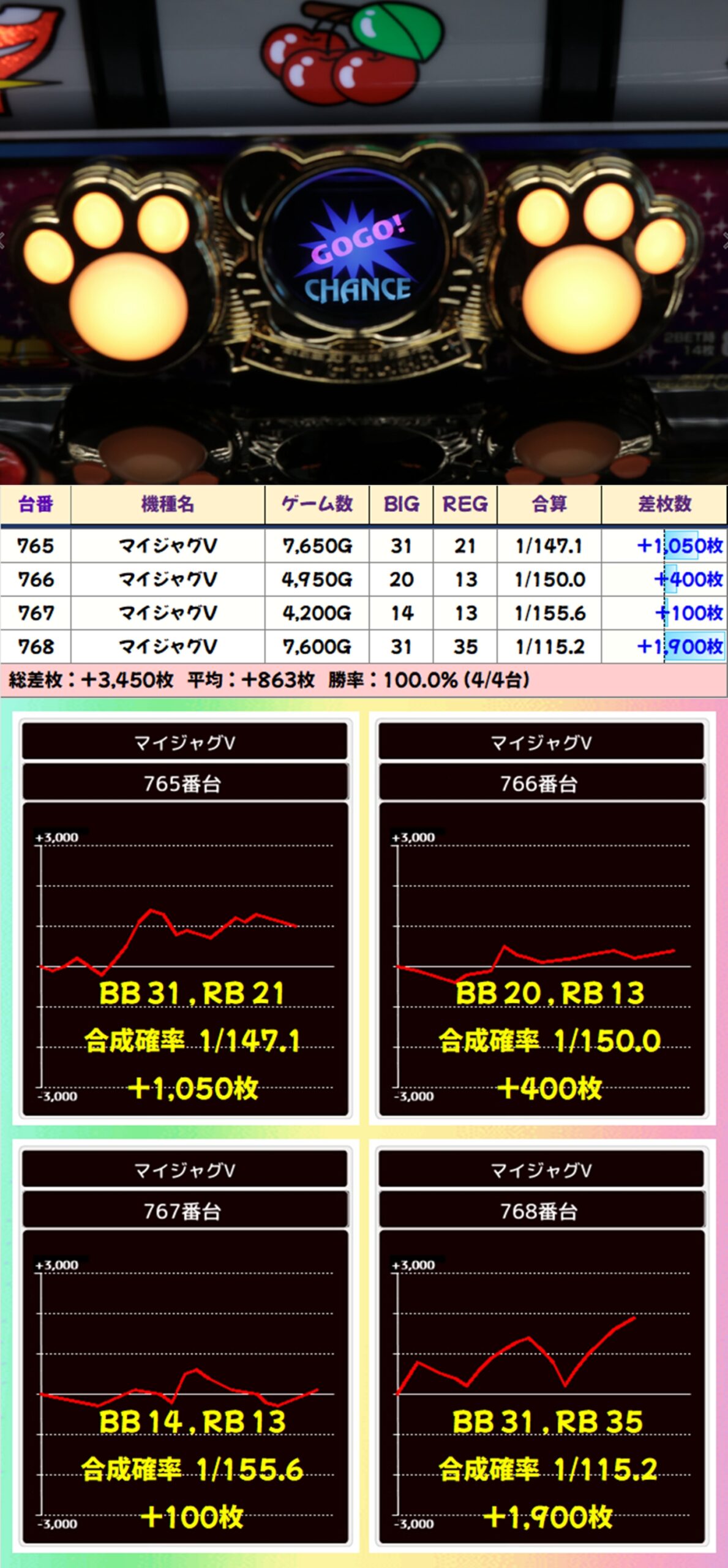 【4台並び】マイジャグV(765-768番台)→平均+863枚