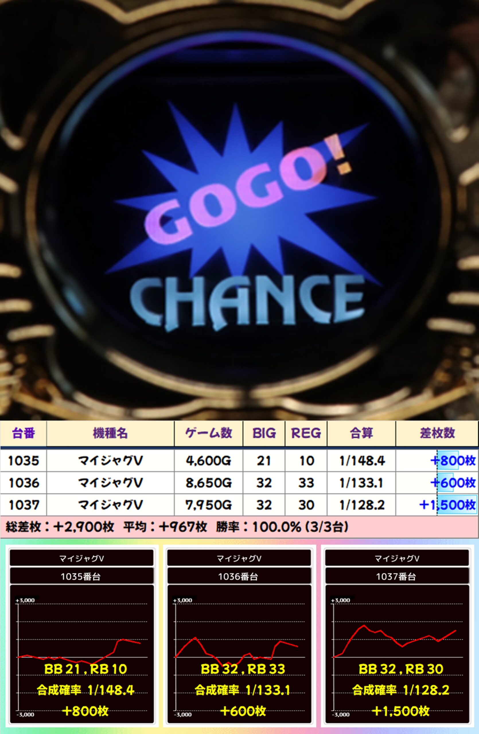 【3台並び】マイジャグV(1035-1037番台)→平均+967枚