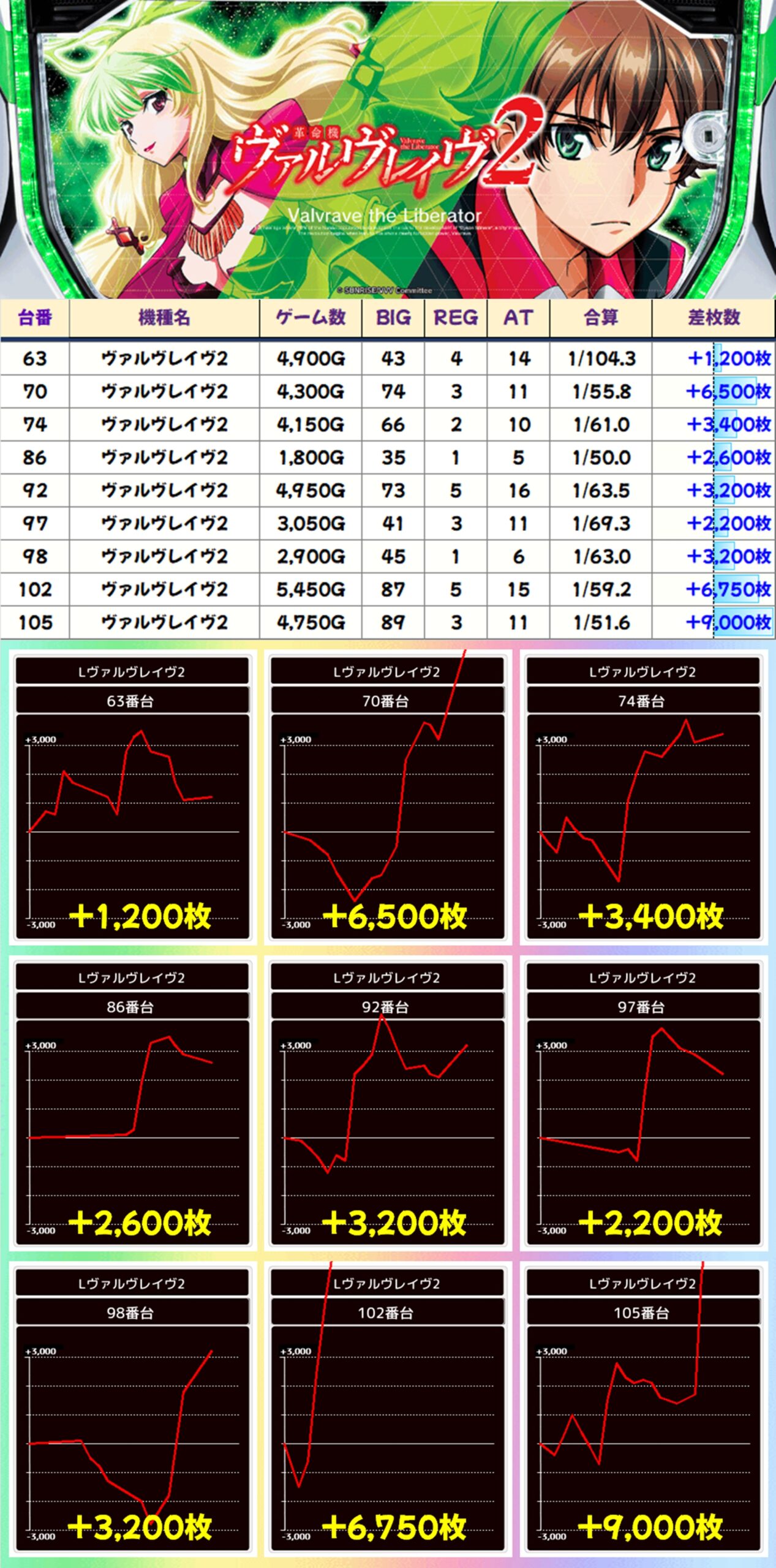 ヴァルヴレイヴ2からも優秀台が多数出現。+9000枚や+6750枚、+6500枚など出玉を伸ばした台が多く見られましたね!
