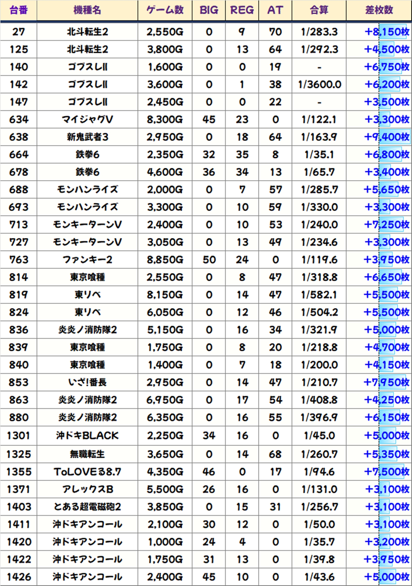 今回も優秀台(+1000枚超)をピックアップしましたので見ていきましょう!