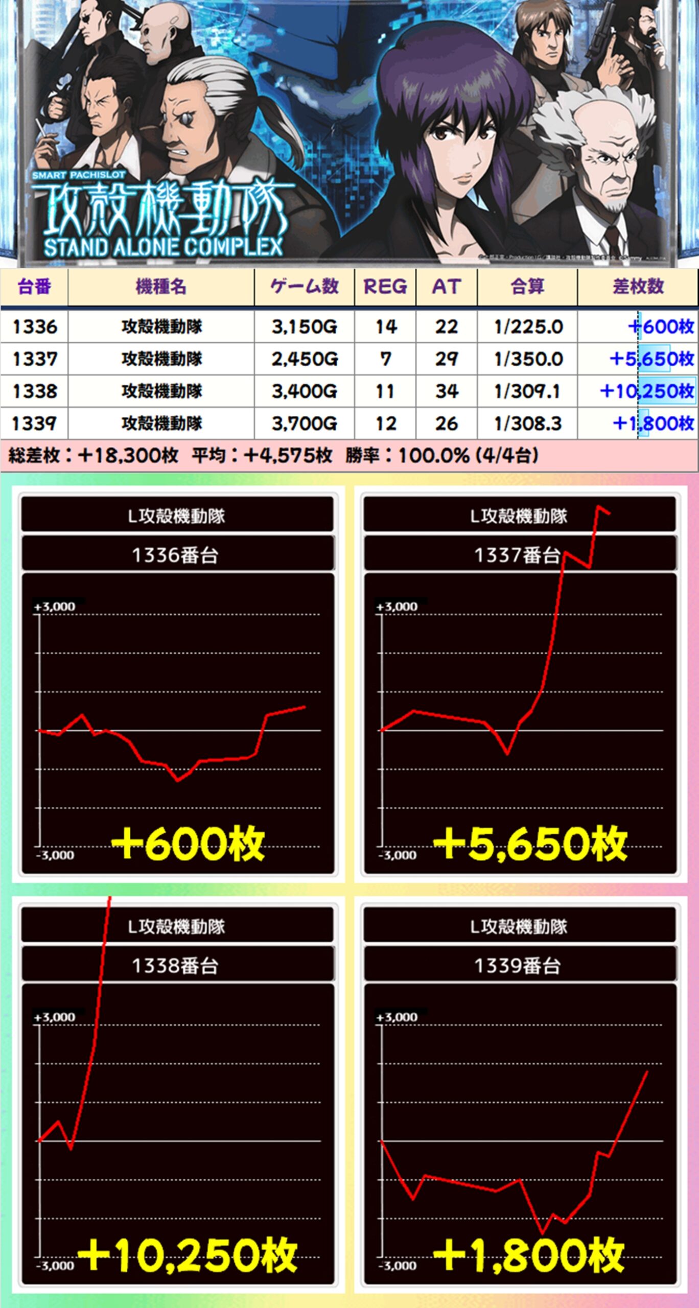いずれの機種からも優秀な出玉を確認でき、攻殻機動隊からは10250枚の万枚オーバーも確認!