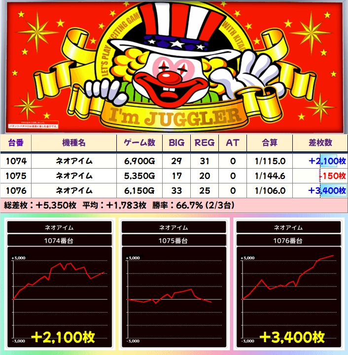【3台並び】ネオアイム(1074〜1076番台)→平均+1,783枚(2/3台+)
