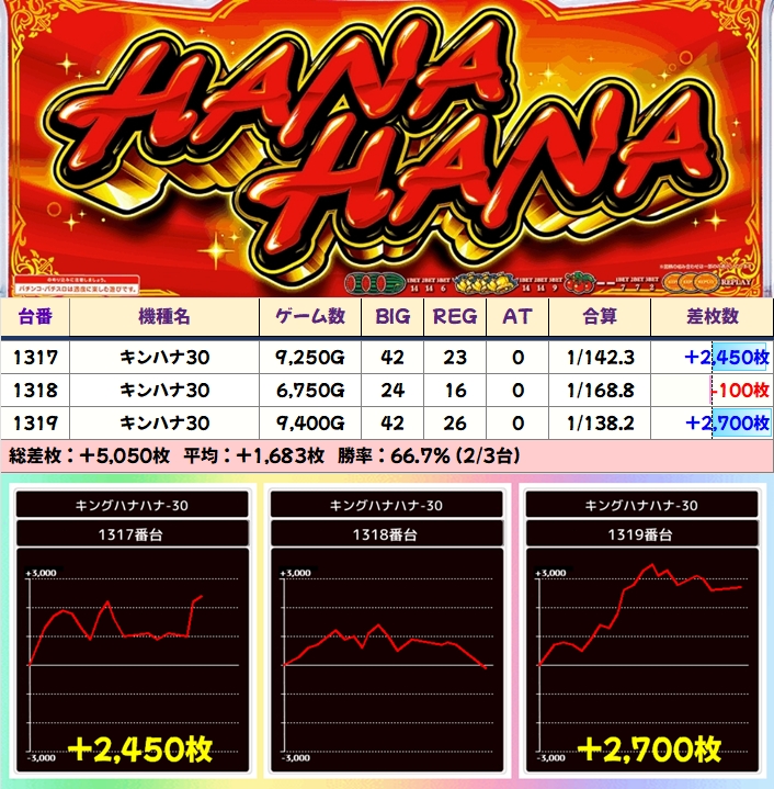 【3台並び】キングハナハナ-30(1317〜1319番台)→平均+1,683枚(2/3台+)