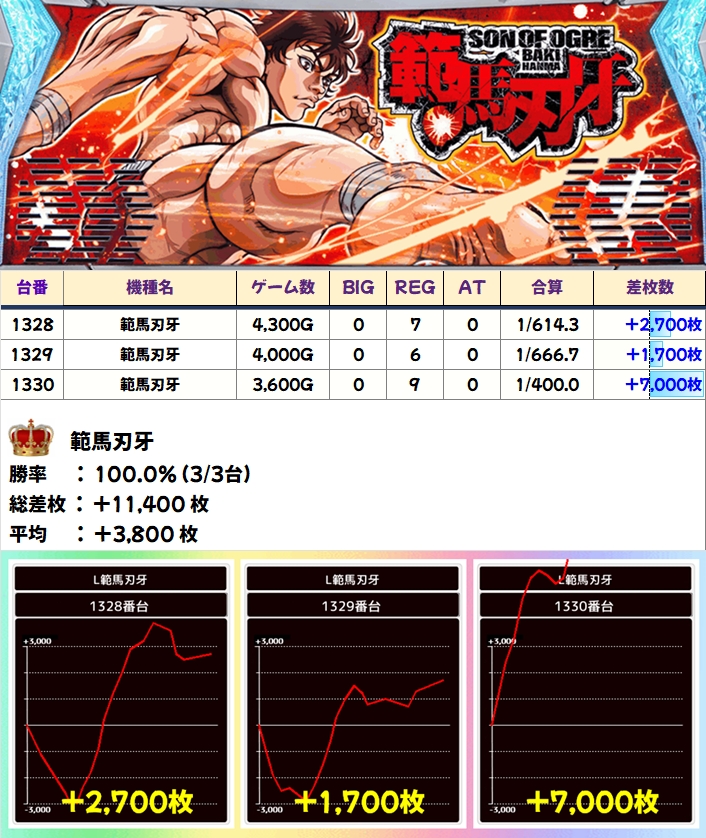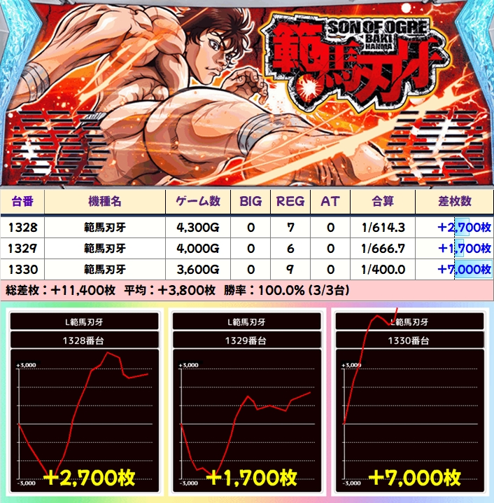 【3台並び】範馬刃牙(1328〜1330番台)→平均+3,800枚(3/3台+)
