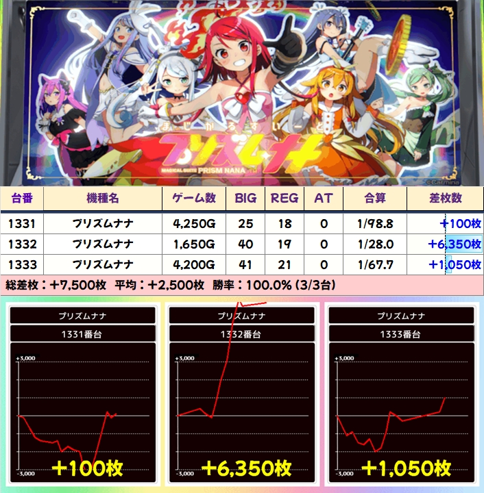 【3台並び】プリズムナナ(1331〜1333番台)→平均+2,500枚(3/3台+)