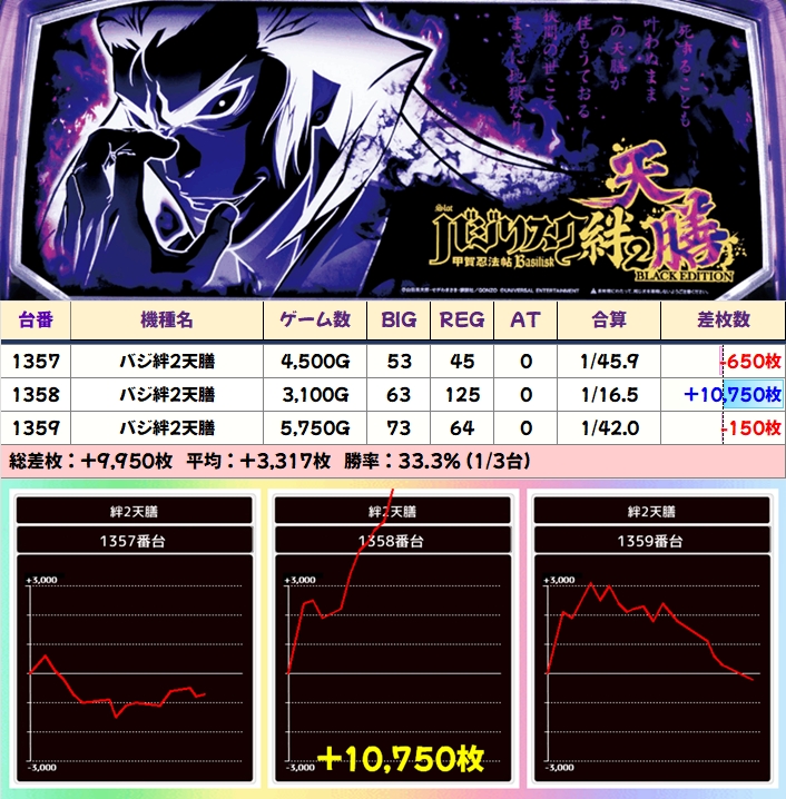 【3台並び】バジリスク絆2天膳(1357〜1359番台)→平均+3,317枚(1/3台+)