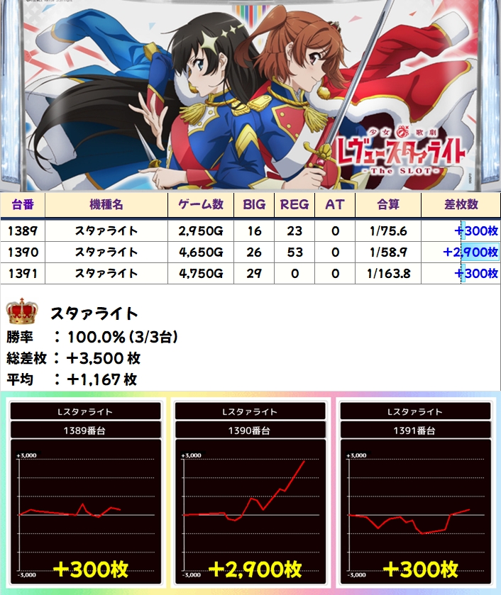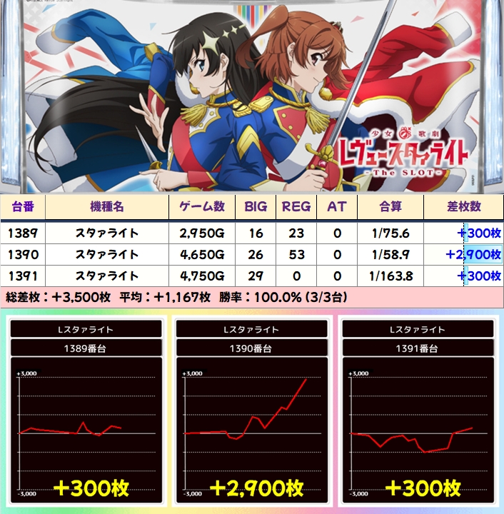 【3台並び】スタァライト(1389〜1391番台)→平均+1,167枚(3/3台+)