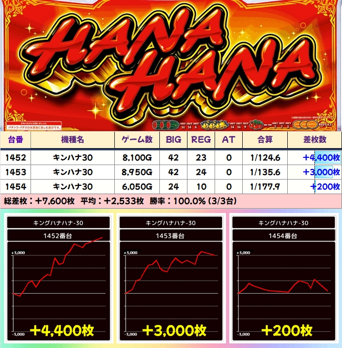 【3台並び】キングハナハナ-30(1452〜1454番台)→平均+2,533枚(3/3台+)