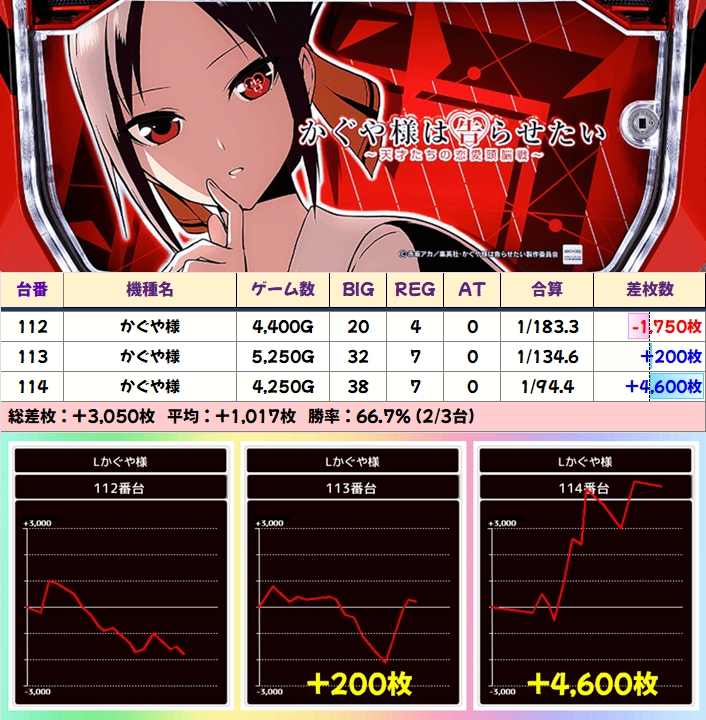 【3台並び】かぐや様(112〜114番台)→平均+1,017枚(2/3台+)