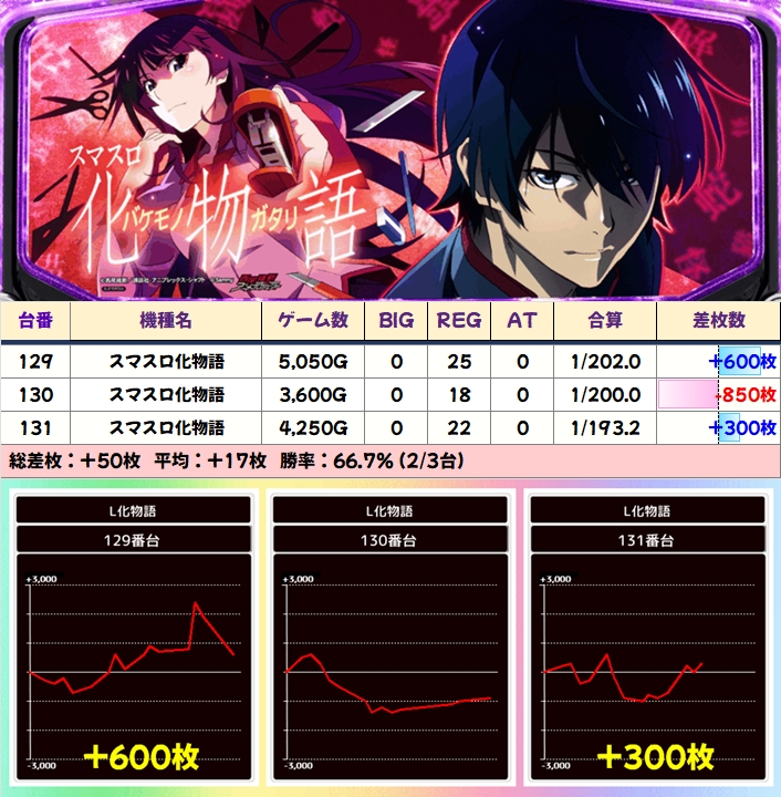 【3台並び】スマスロ化物語(129〜131番台)→平均+17枚(2/3台+)