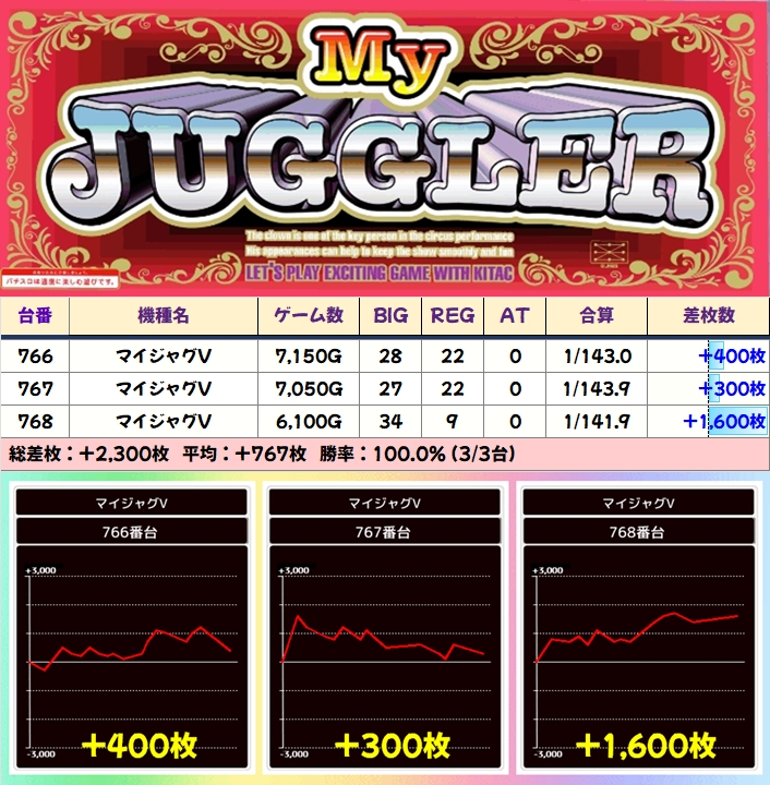 【3台並び】マイジャグV(766〜768番台)→平均+767枚(3/3台+)