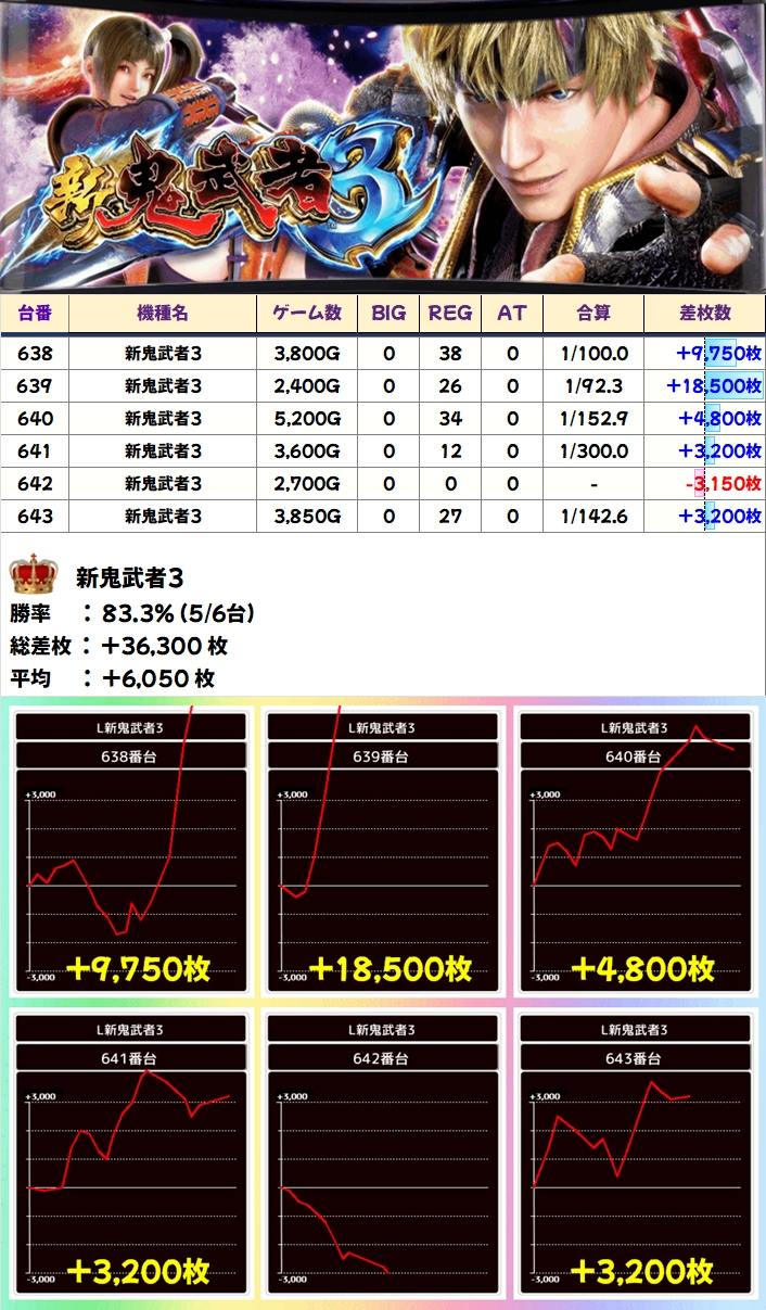 上記の機種の中からは大量出玉も確認でき、新鬼武者3からは+18500枚のコンプリート台が出現! また、戦国乙女4からも+18150枚のコンプリート級の出玉も確認することができました。