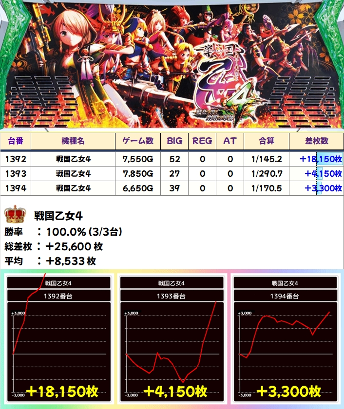 【3台並び】戦国乙女4(1392〜1394番台)→平均+8,533枚(3/3台+)