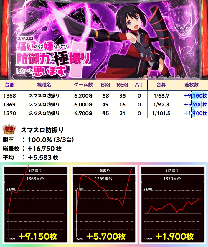 【3台並び】スマスロ防振り(1368〜1370番台)→平均+5,583枚(3/3台+)