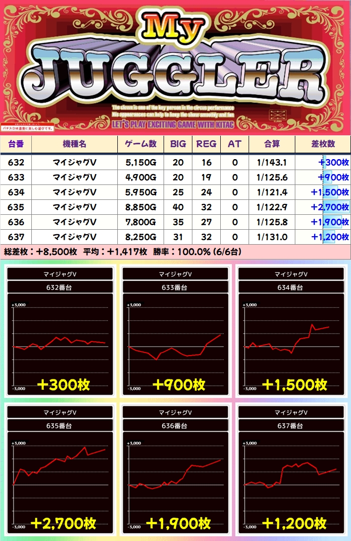 【列仕掛け】マイジャグV(632〜637番台)→平均+1,417枚(6/6台+)